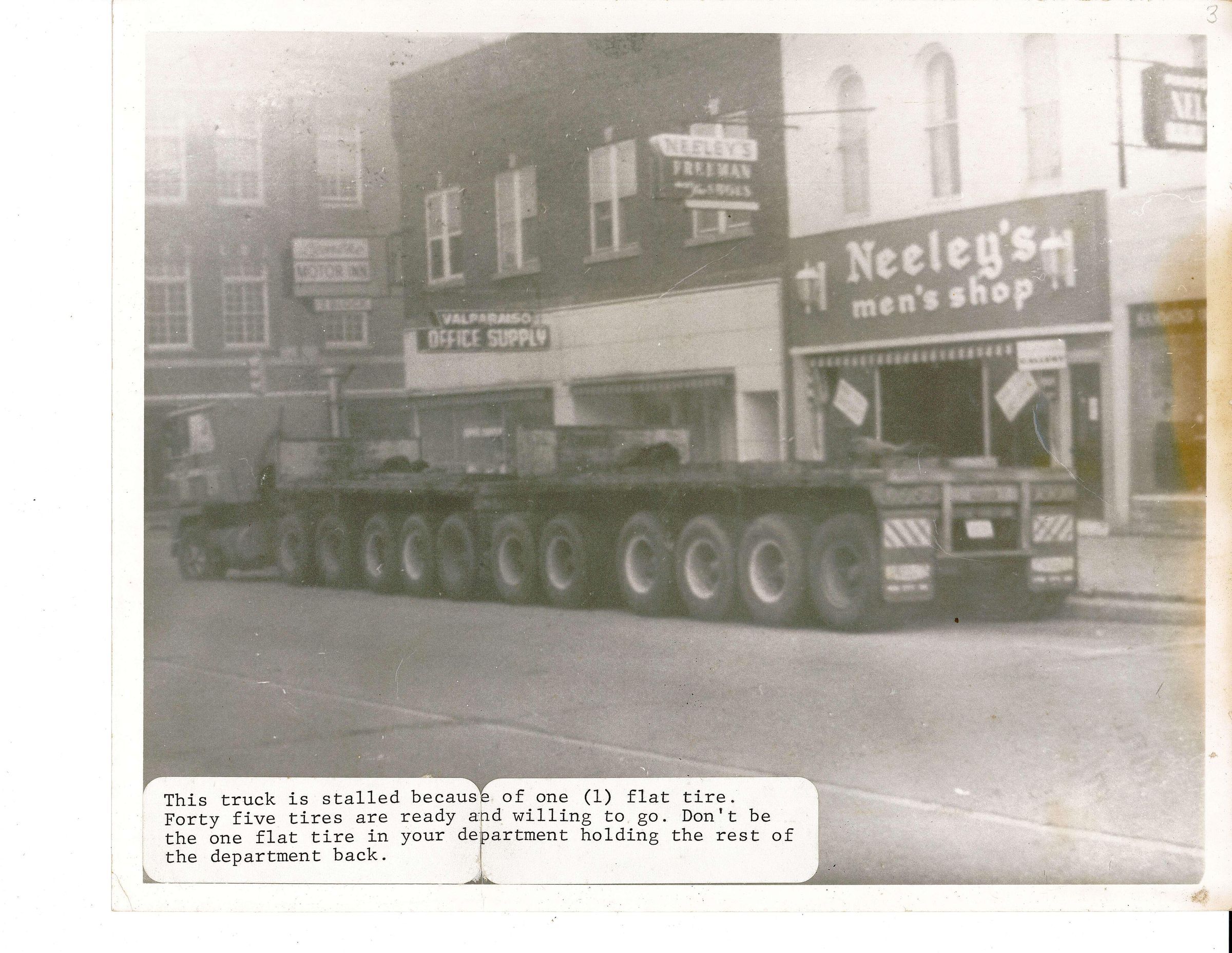 Black and white photograph of downtown Valparaiso block, with a large semi-truck stopped in front of the storefronts. Stickers in lower left hand corner are printed with a motivational message, "This truck is stalled because of one (1) flat tire. Forty five tires are ready and willing to go. Don't be the one flat tire in your department holding the rest of your department back."Acquisition