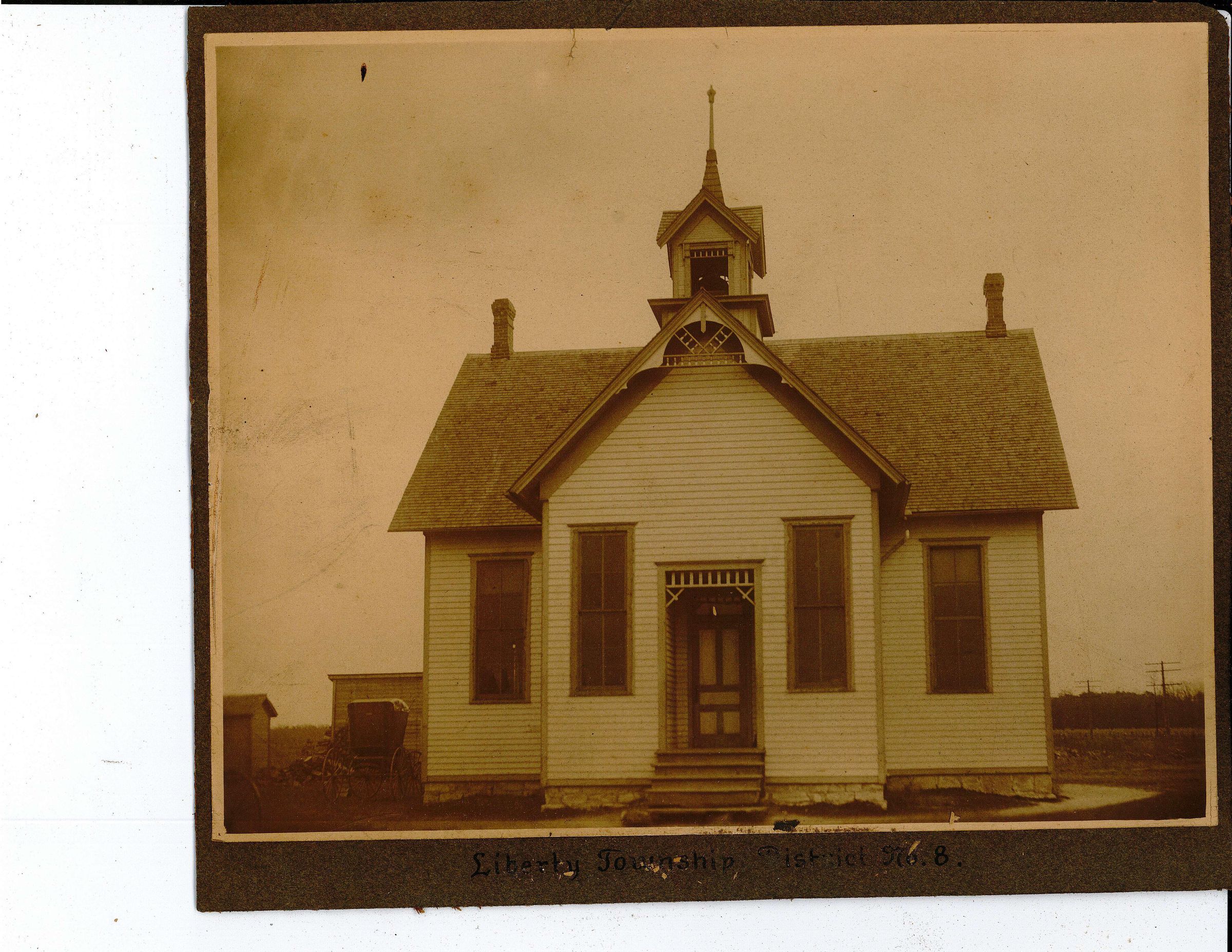 Sepia-toned photograph of the exterior of the Liberty Township School, circa 1900, mounted on cardboard.Acquisition