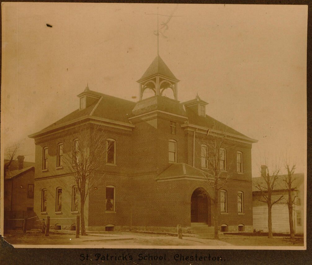 Sepia-toned photograph of the exterior of Saint Patrick's School in Chesterton, circa 1900, mounted on cardboard.Acquisition