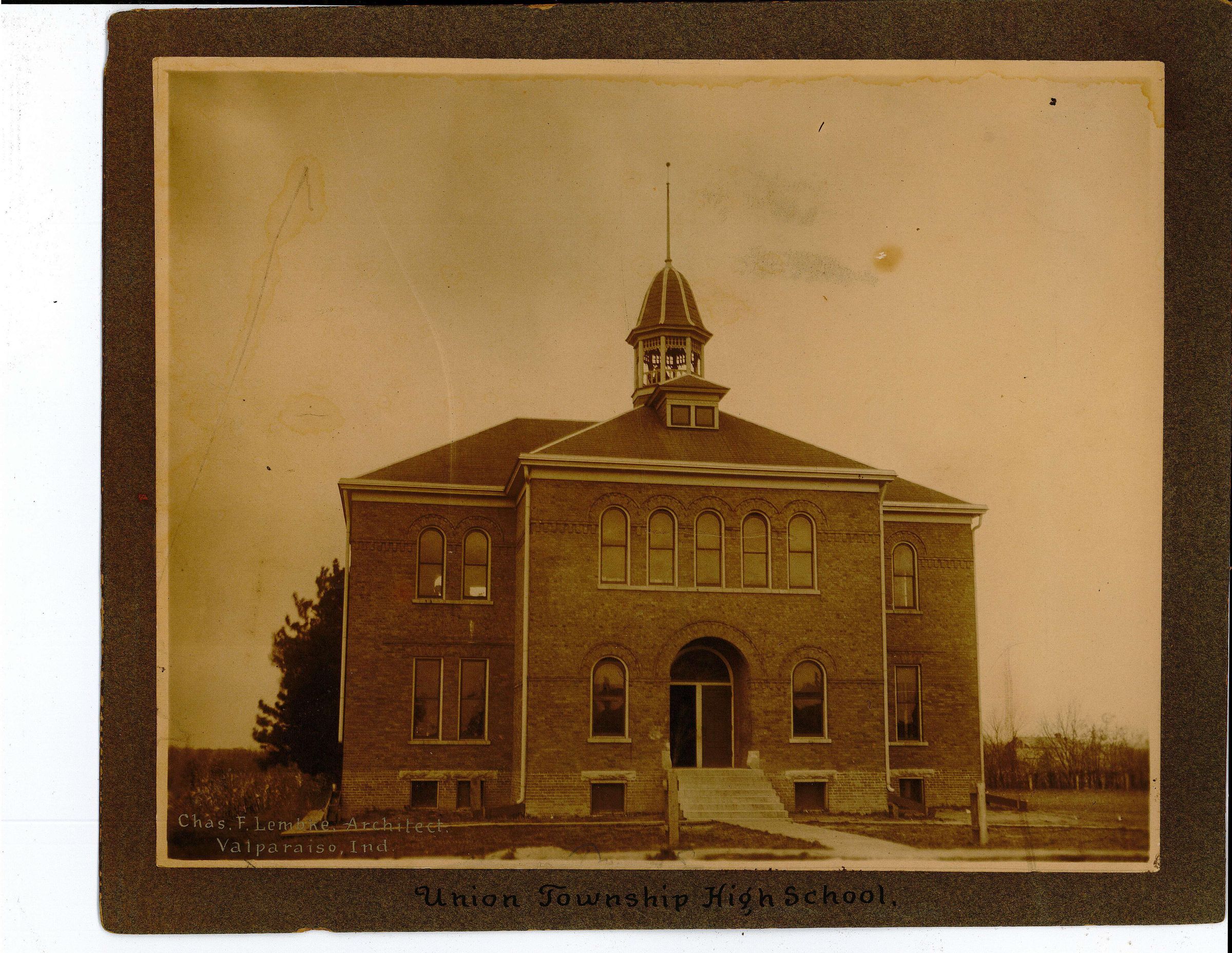Sepia-toned photograph of the Union Township High School building, circa 1910, mounted on cardboard. Building was designed by Charles Lembke, of Valparaiso.Acquisition