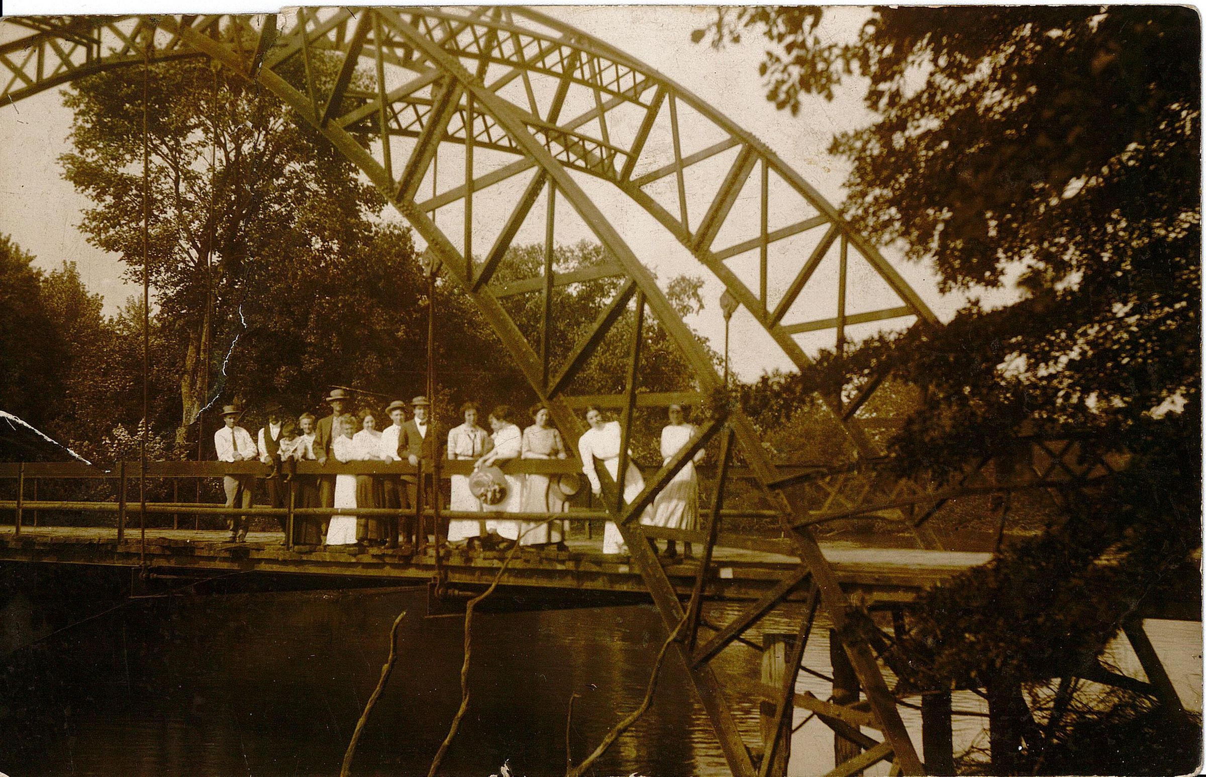 Item is a postcard of a black and white photograph of a group of Victoriana-era young women and men posing on Dunn's Bridge, near Kouts.Acquisition