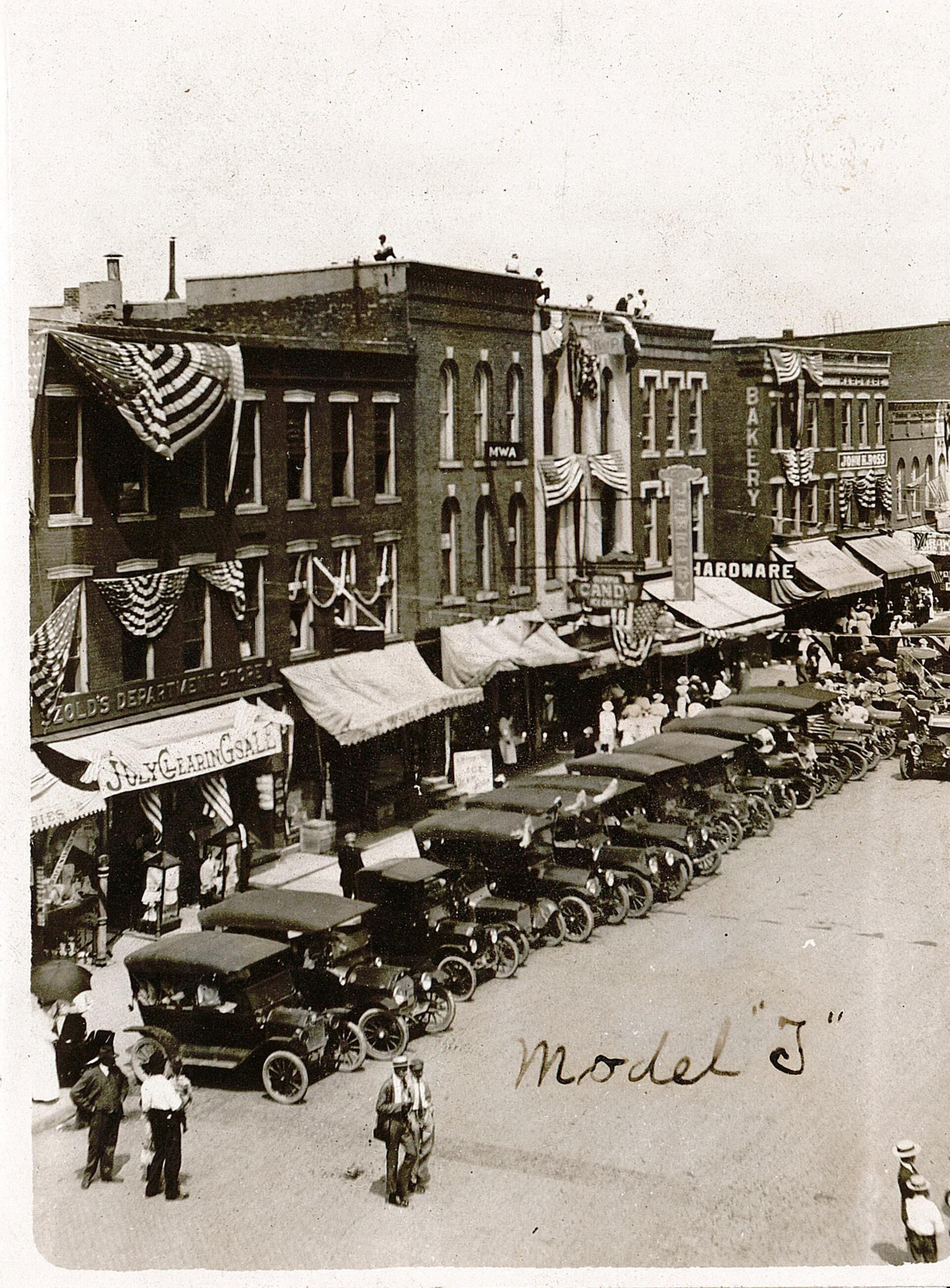 Black and white photograph of a Fourth of July parade on Lincolnway in downtown Valparaiso. Image features a row of black Model T automobiles. Visible storefronts include Szold's Department Store, HS Herrick, and FM Clifford and FR Marine, Lawyers.Acquisition