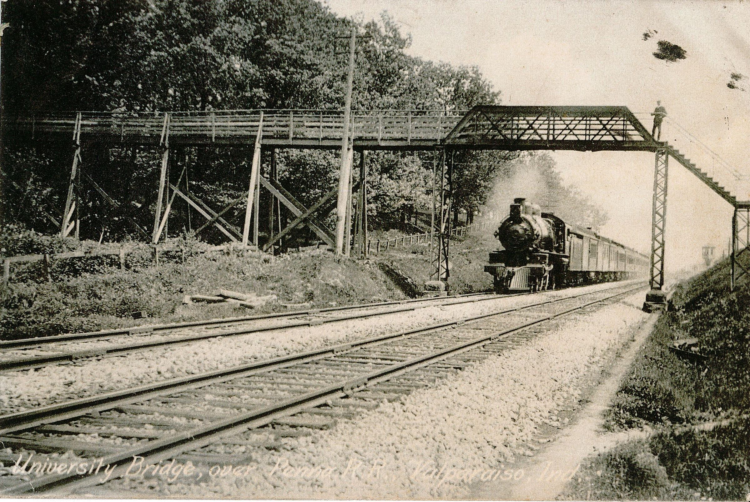 Item is a black and white photographic postcard of the University Bridge, over the Pennsylvania Railroad Station. Back is postmarked 1906 and addressed to Miss Mabel Love of Union Center, Ind.Acquisition
