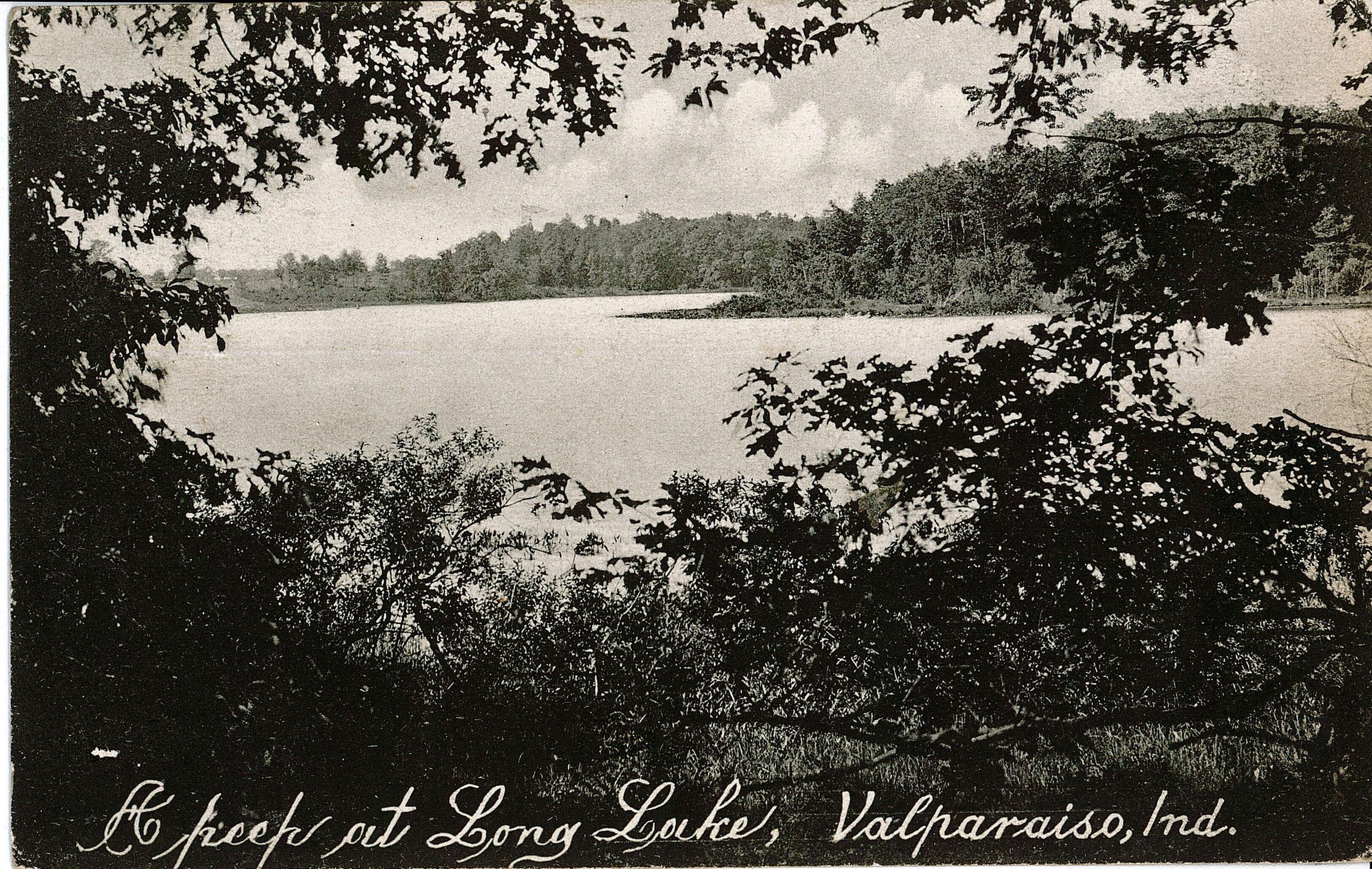 Item is a black and white photographic postcard of a view of Long Lake, looking through trees at the shore.Acquisition