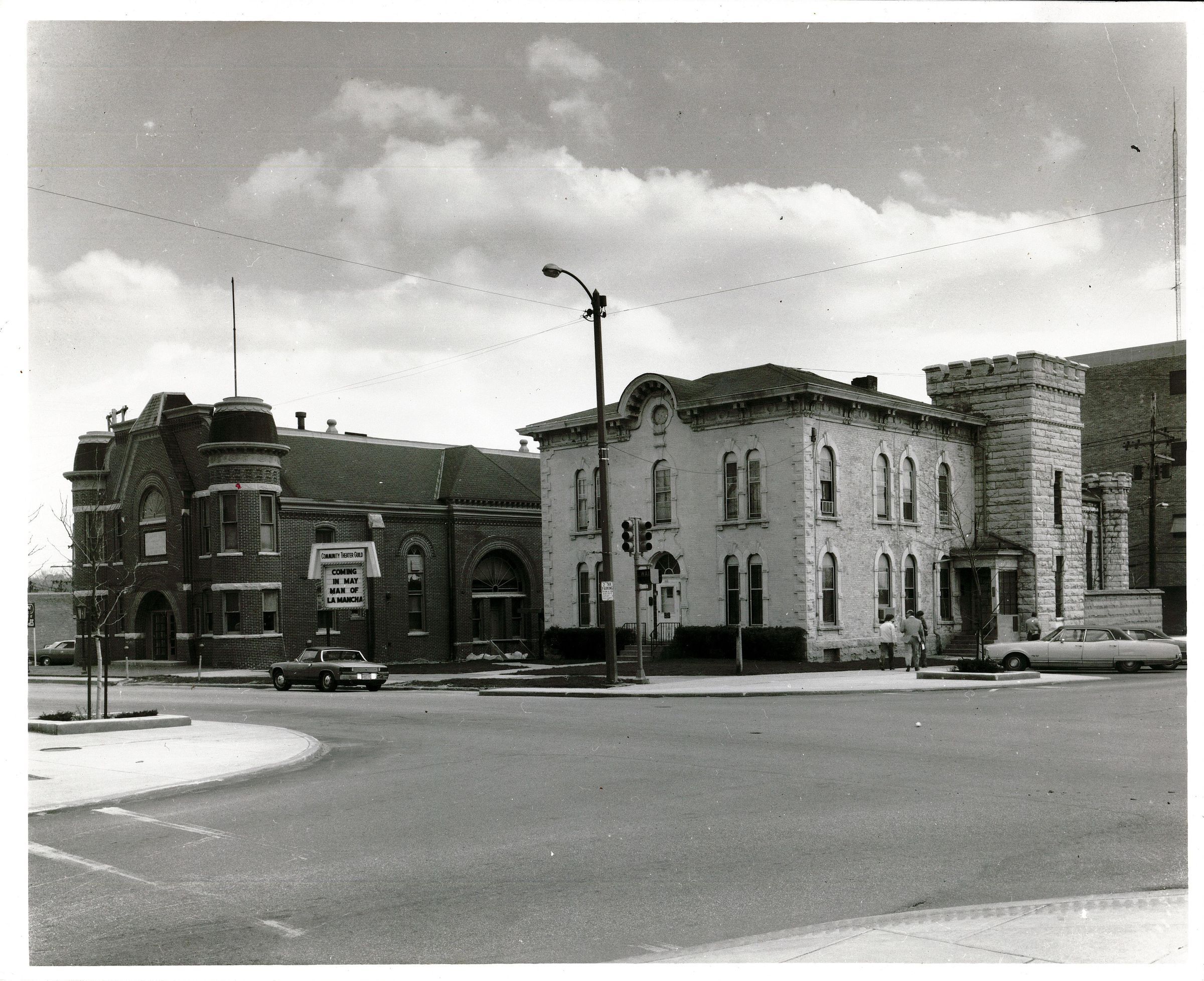 Black and white photograph of the Porter County Museum (sheriff's residence and historic jail), looking east to the Memorial Opera House. A car is parked between the two buildings and a sign advertises "Man of La Mancha" coming in May to the Memorial Opera House. Image is visually striking.Acquisition