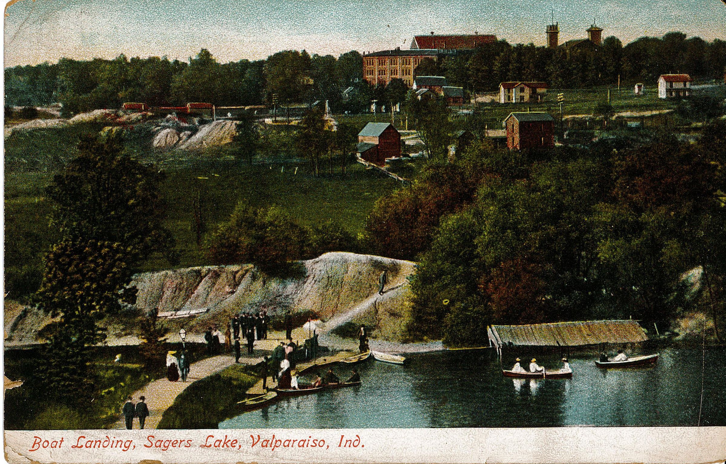 Item is a tinted photographic postcard of the Boat Landing at Sager's Lake on the south side of Valparaiso, circa 1911. The towers and buildings of old Valparaiso University are visible in the background.Acquisition