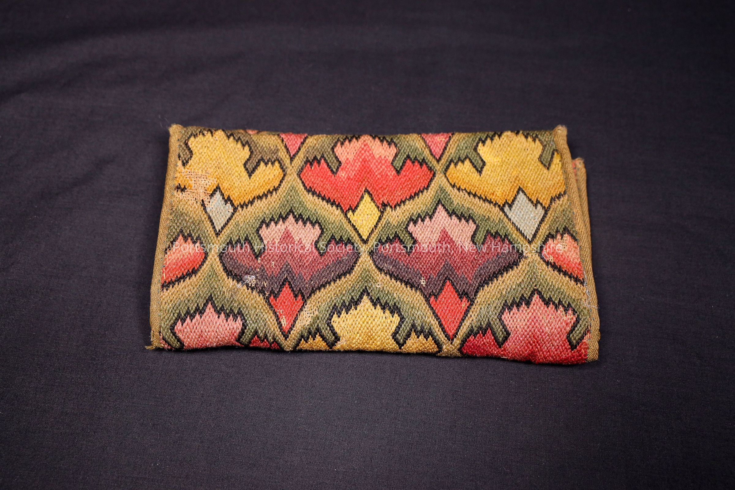 Red, yellow, green, and blue canvaswork man’s wallet dates to the late eighteenth century. The initials "D.W." and "E.[?] P." are stitched on the inside of the wallet. Jelly tag with red border found on inside of wallet saying "Tripp P.H.S." indicating that the donor was Miss Lizzie Tripp.Collection
