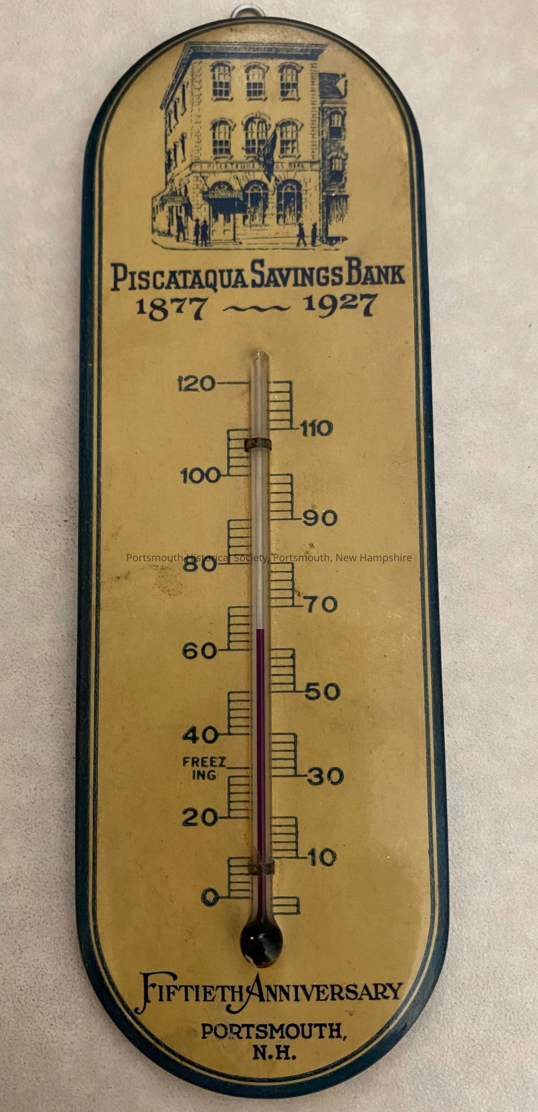 Thermometer, indoor, oval in form with hanging hook at top. Image of bank above "Piscataqua Savings Bank / 1877-1927" with "Fiftieth Anniversary / Portsmouth / NH" at bottom. Parisian Novelty Company label on back.Collection