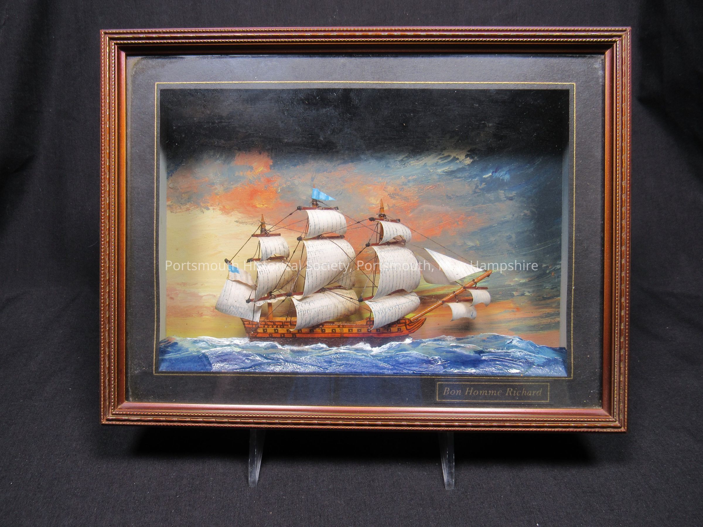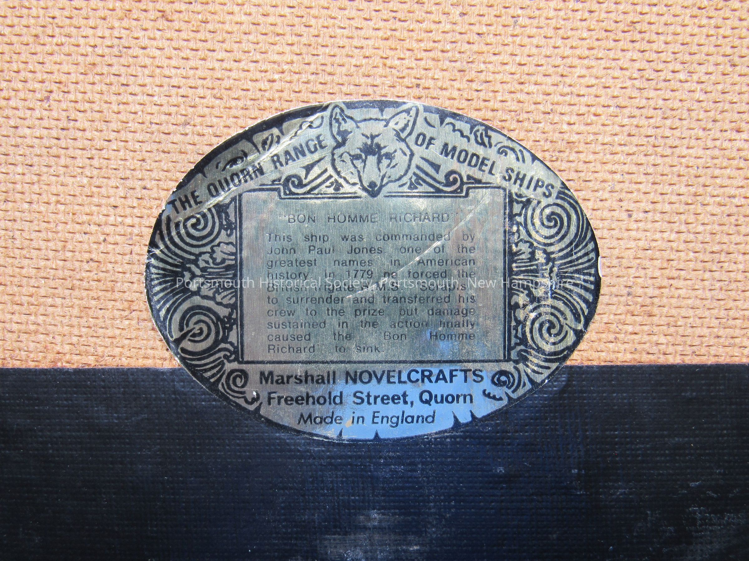 Shadow-box model of Bon Homme Richard. Mixed media. H. 7 in., W. 9 1/8 in., D. 2 in. Sticker on back reads: ‘THE QUORN RANGE OF MODEL SHIPS / Marshall NOVELCRAFTS / Freehold Street, Quorn, Made in England,” with additional text about the ship.Collection