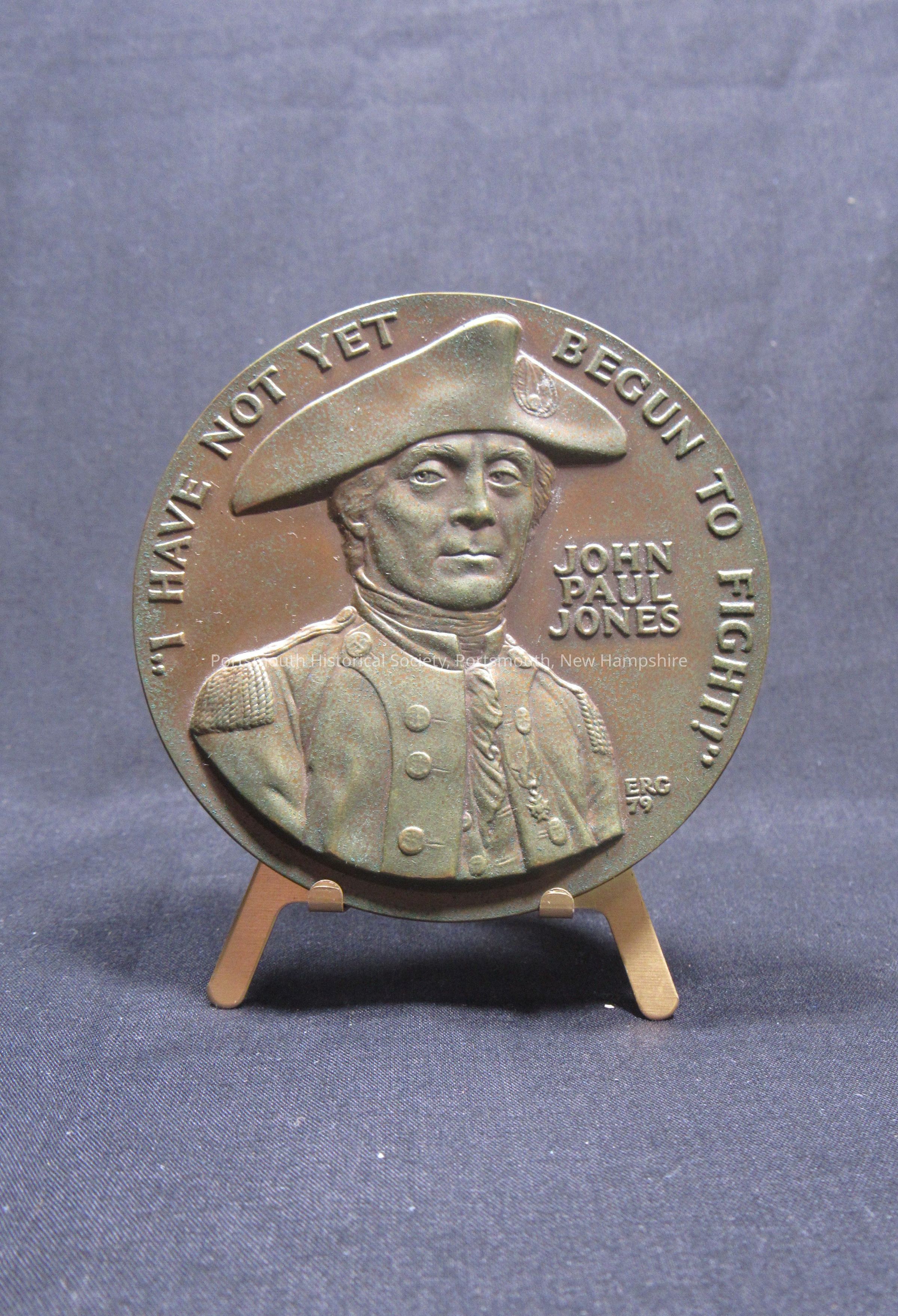 Medal, featuring JPJ and Bon Homme Richard. Bronze with stand, in light-blue original box. Medal diam. 3 in. Medal marked ERG / 79.Collection