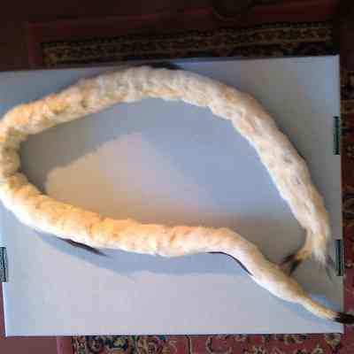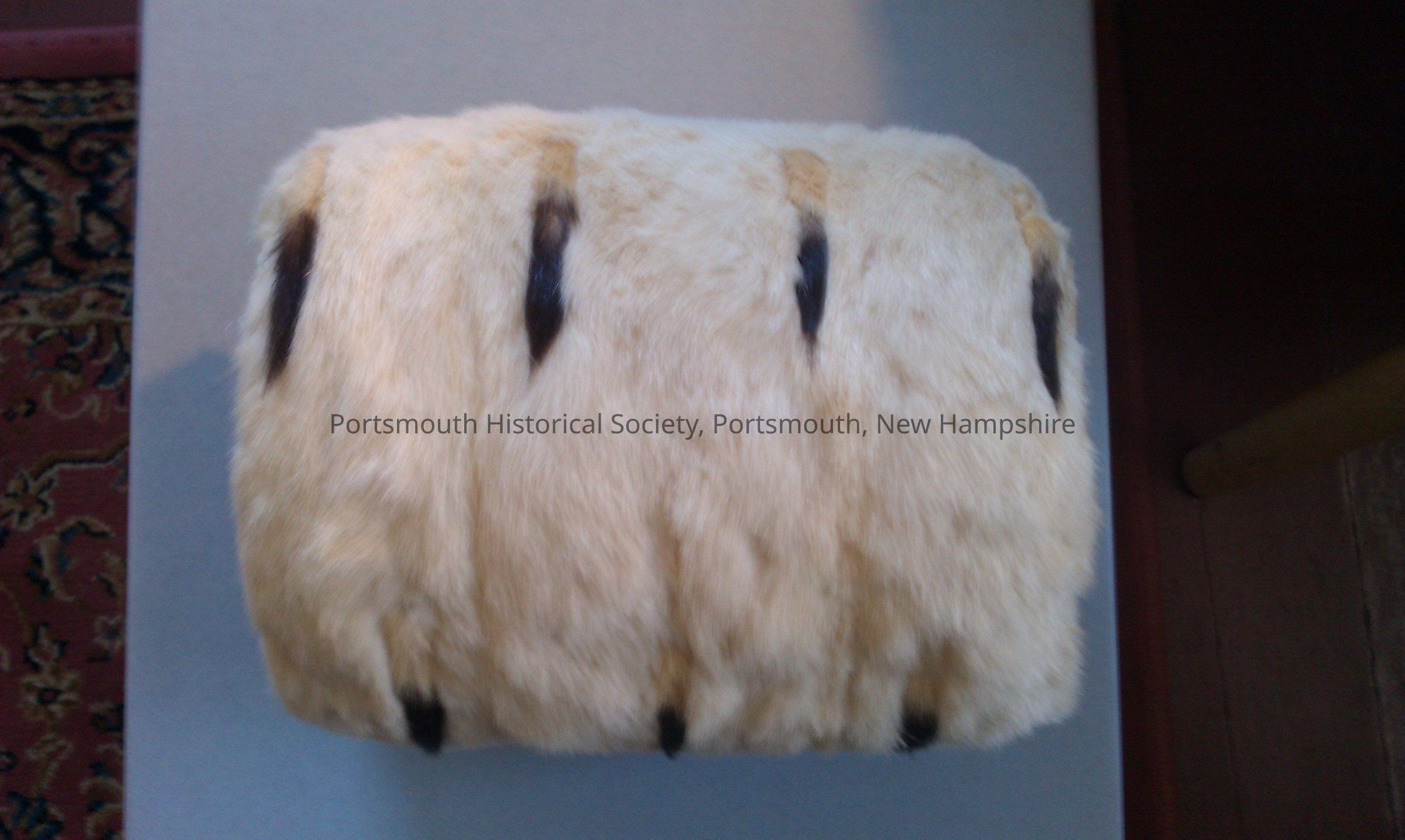 Ermine muff with silk lining. Belonged to Abbie Rowell Tredick, possibly purchased for her January 1870 wedding. The muff is lined in silk, and is rather petite in proportion. Also includes matching ermine neckpiece.