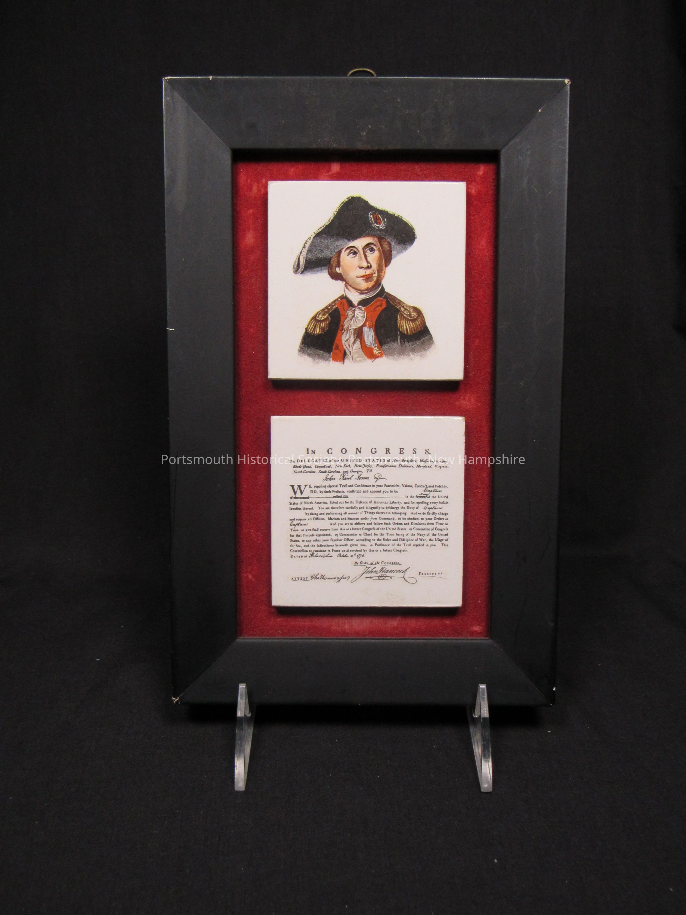 Two tiles in frame, featuring JPJ (after Peale portrait) and facsimile of his commission, mounted on velvet backing and in wooden frame. Late 20th century.Collection