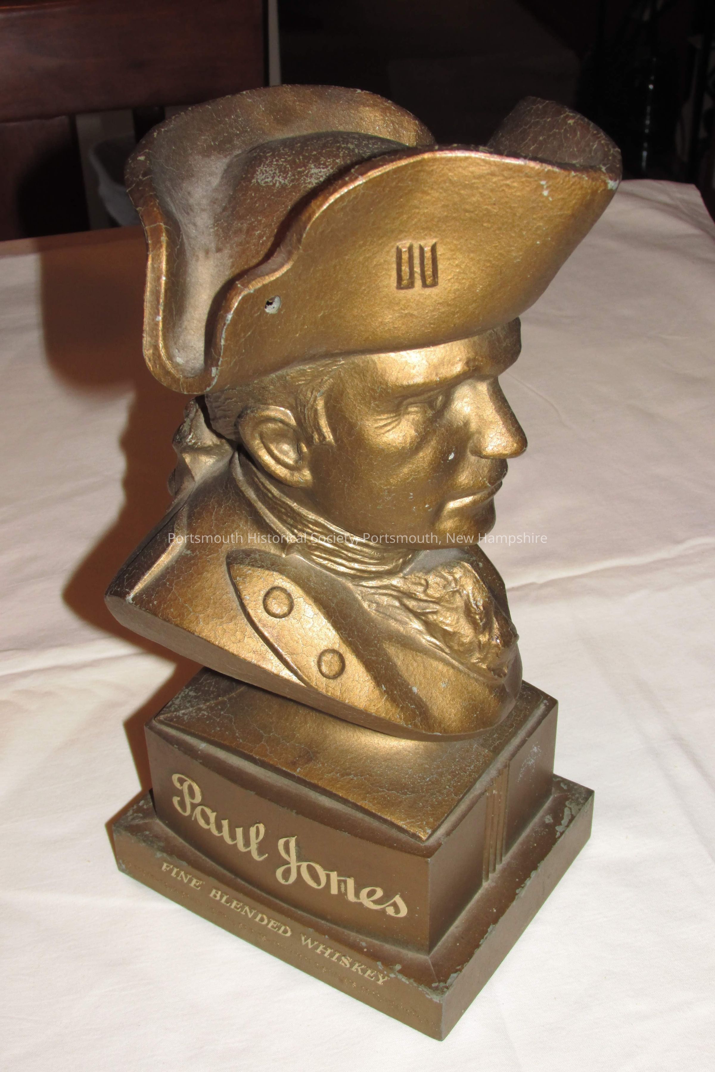“Paul Jones” advertising bust, gilt coloring. Inscribed on sides: “Paul Jones” above “FINE BLENDED WHISKEY” above “86 PROOF – 72 ½% GRAIN NEUTRAL SPIRITS—FRANKFORT DISTILLERS CORP. NEW YORK, N.Y.” H. 11 in., W. base 4 ½ in., D. base 5 ¾ in.Collection