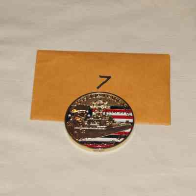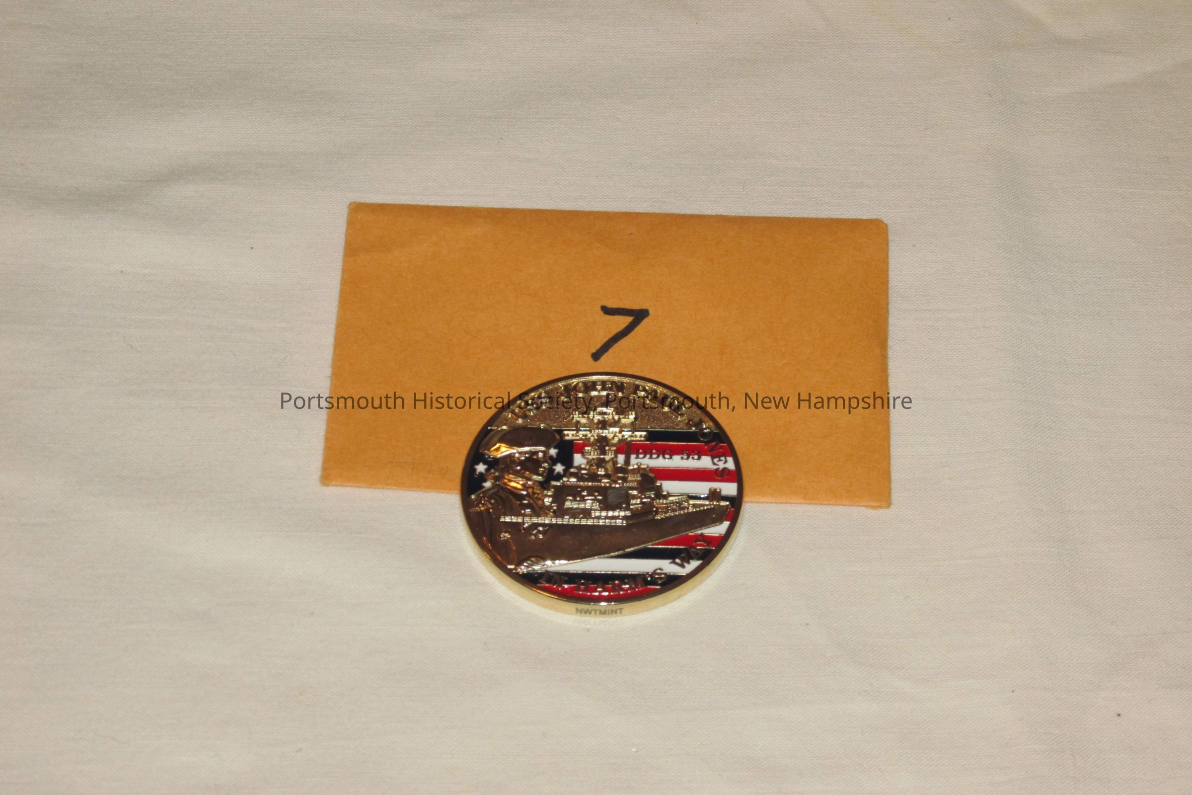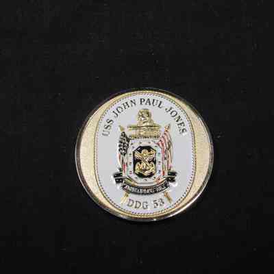 Coin/token: “USS JOHN PAUL JONES / DDG 53” on one side; “USS JOHN PAUL JONES / DDG 53 /IN HARMS WAY” on the reverse. Base metal, red, white, and blue enamel. Diam. 1 ¾ in.Collection