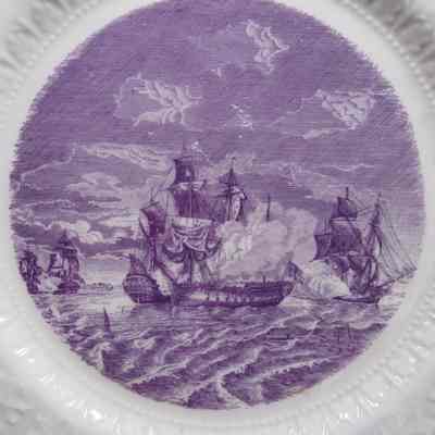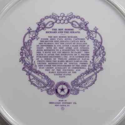 Ceramic plate with transfer-printed scene in purple of the Bonhomme Richard and Serapis and with slightly raised, molded edge. Diam. 10 ¾ in. Marked on back: “MADE BY / SHENANGO POTTERY CO. / NEW CASTLE, PA. / [with “1” in a circle].” Legend on back, within border of militaria, reads in all caps: “THE BON HOMME / RICHARD AND THE SERAPIS / THE BON HOMME RICHARD, UNDER JOHN PAUL JONES, CAPTURED / THE BRITISH SHIP, SERAPIS, CAPTAIN RICH- / ARD PEARSON, OFF THE COAST OF ENGLAND / ON SEPTEMBER 22, 1778, AFTER A HARD FIGHT AT / NIGHT. WITH HIS SHIP AFIRE AND SINKING, /JONES RETORTED TO A SUGGESTION TO SURREN- / DER, ‘I HAVE NOT YET BEGUN TO FIGHT.’ THIS / SCENE IS AFTER THE ENGRAVING BY T. PELTRO / PUBLISHED DECEMBER 1, 1781. IT IS NUMBER ONE / OF A SERIES OF TWELVE AMERICAN NAVAL / PRINTS FROM THE MABEL BRADY GARVAN COL- / LECTION REPRODUCED BY SPECIAL PERMIS- / SION UNDER THE SPONSORSHIP OF THE AMER- / ICAN LEGION AUXILIARY IN COMMEMORA- / TION OF THE FOUNDING AND / EARLY EXPLOITS OF THE / UNITED STATES / NAVY.”Collection
