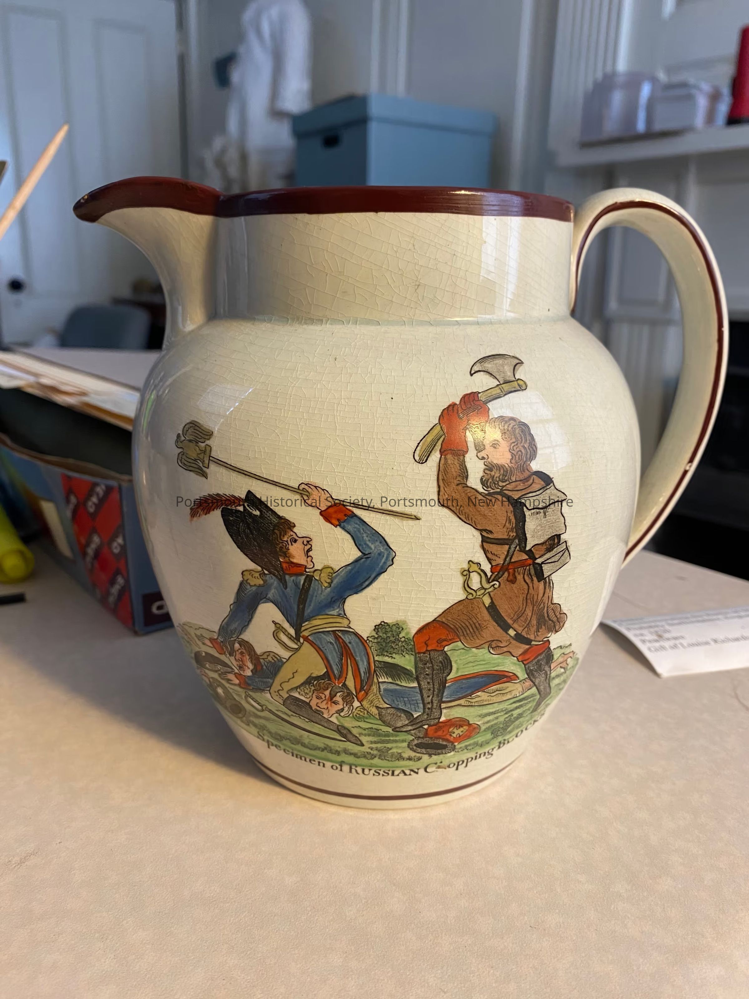 Pitcher regarding the Battle of Moscow 1812. Depicted on one side is an image of a Russian soldier attacking a French soldier with an axe with writing along the bottom saying, "Specimen of RUSSIAN Chopping BLOCKS". The other side shows a Russian soldier carrying slain French soldiers on his bayonet with writing along the bottom saying, "A RUSSIAN BOOR returning from his FIELD SPORTS."