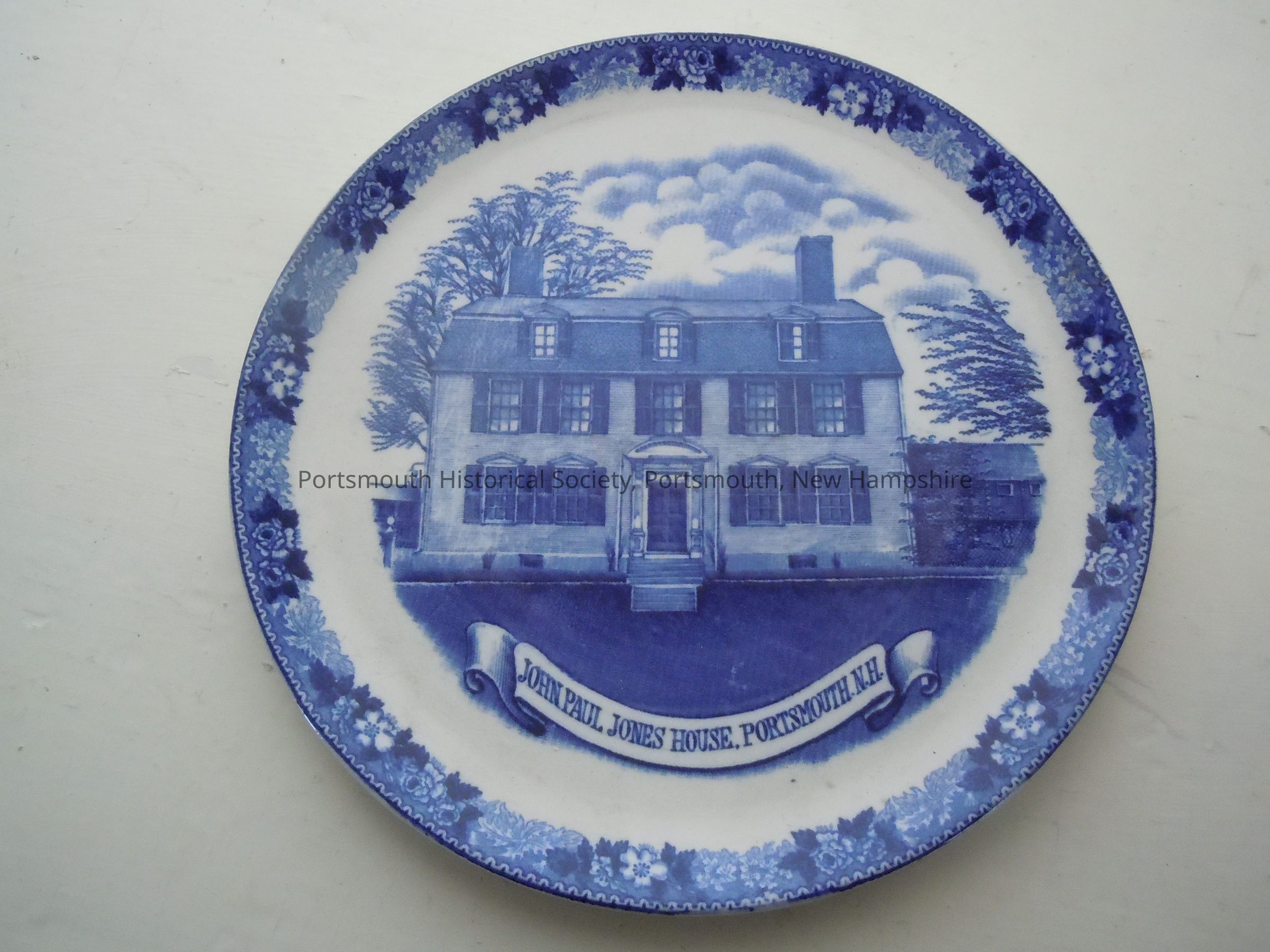 Blue and white ceramic plate with image of the John Paul Jones House on the front. Rim has floral pattern.Acquisition