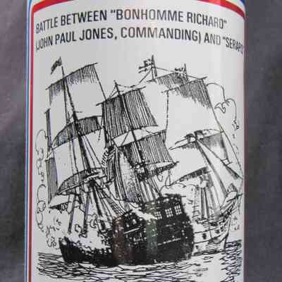 “Ortleib’s” 12 oz. beer can. Henry F. Ortleib Brewing Co., Philadelphia, ca. 1976. Aluminum; H. 4 ¾ in., diam. 2 ½ in. Opened on the bottom, no contents. Image and text relating to JPJ, Bon Homme Richard, and Serapis on side.Collection