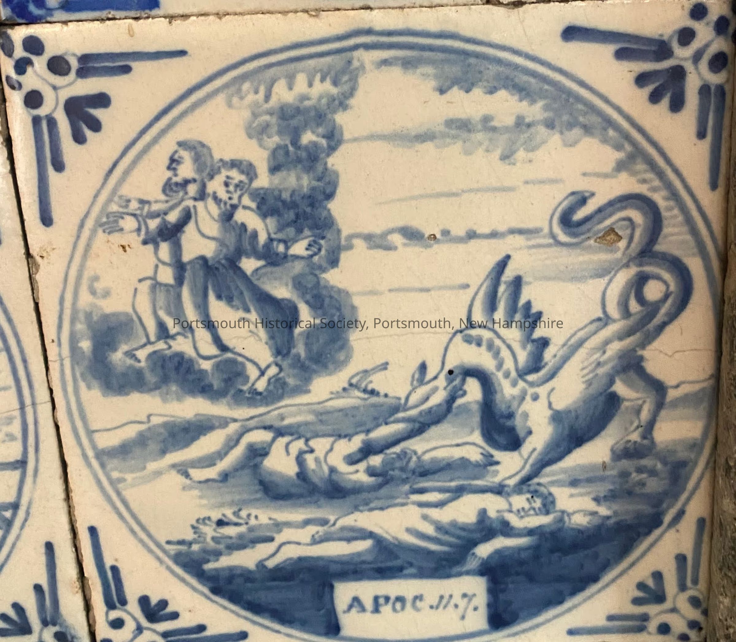Blue and white Delft ceramic tile with ox-head borders. Image is of a dragon eating a person with two people fleeing behind it. Underneath is "APOC. 11.7" referencing Revelations chapter 11 verse 7.Collection