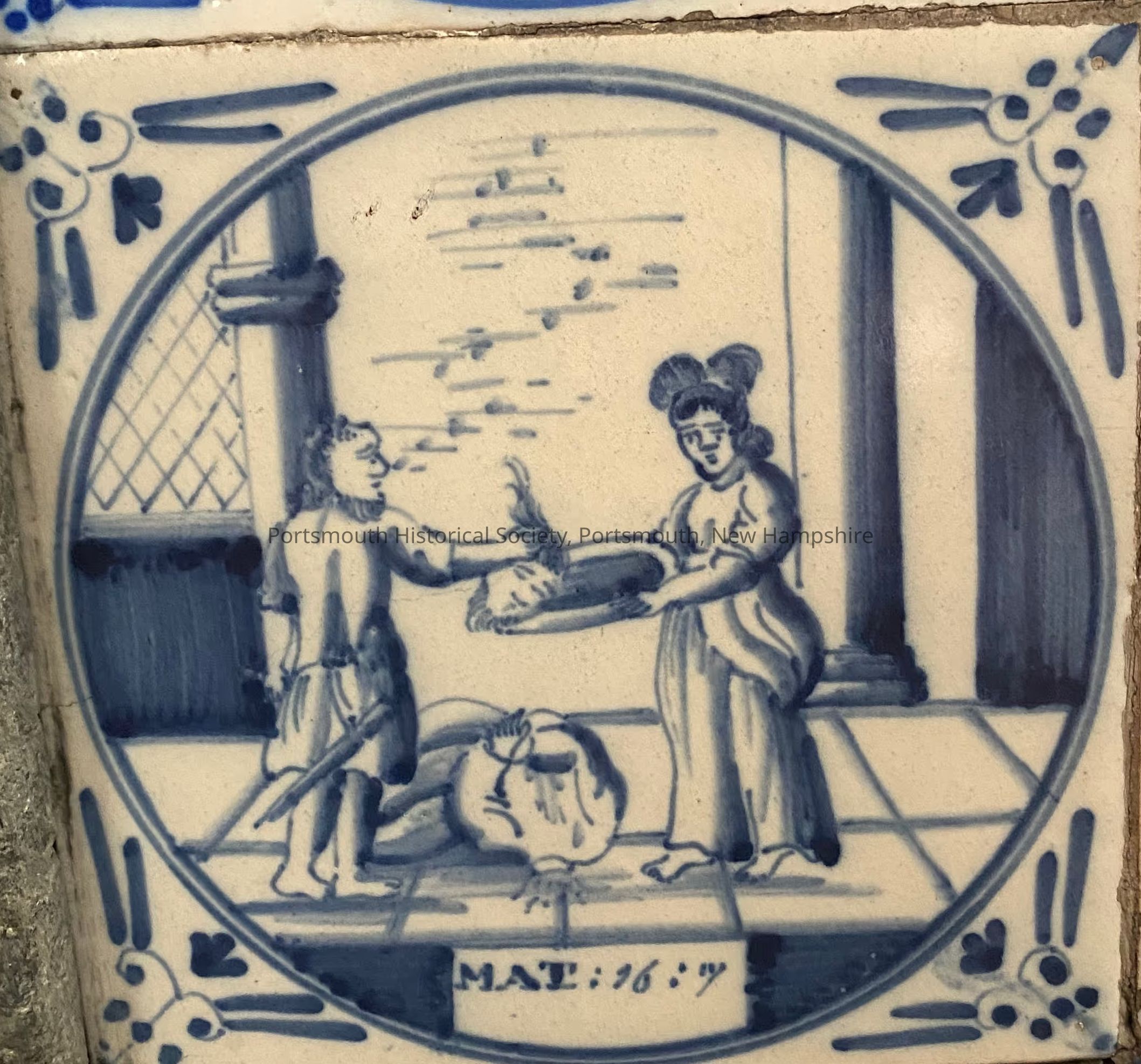 Blue and white Delft ceramic tile with ox-head borders. Image is of a man putting a decapitated head on a platter being held by a woman. Underneath is "MAT: 16:7" referencing Matthew chapter 16 verse 7. However the image is more related to Chapter 14, so it may be a misprint.Collection
