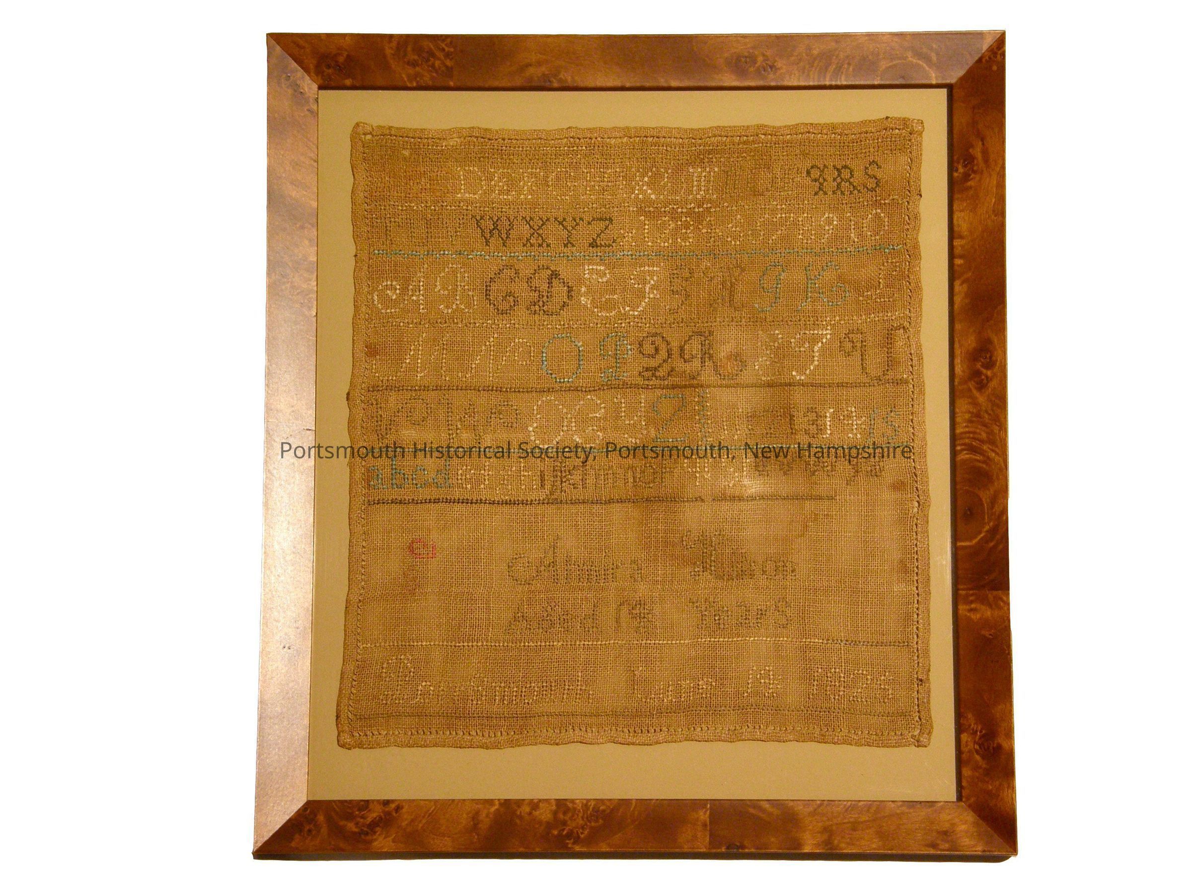 Sampler on linen ground with likely linen thread. Techniques used include cross stitch as well as drawnwork around the edge. Simple composition for this date, with rows of alphabets and numerals. Signed "Almira Hilton/ Aged 14 Years/ Portsmouth June 14 1825."