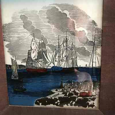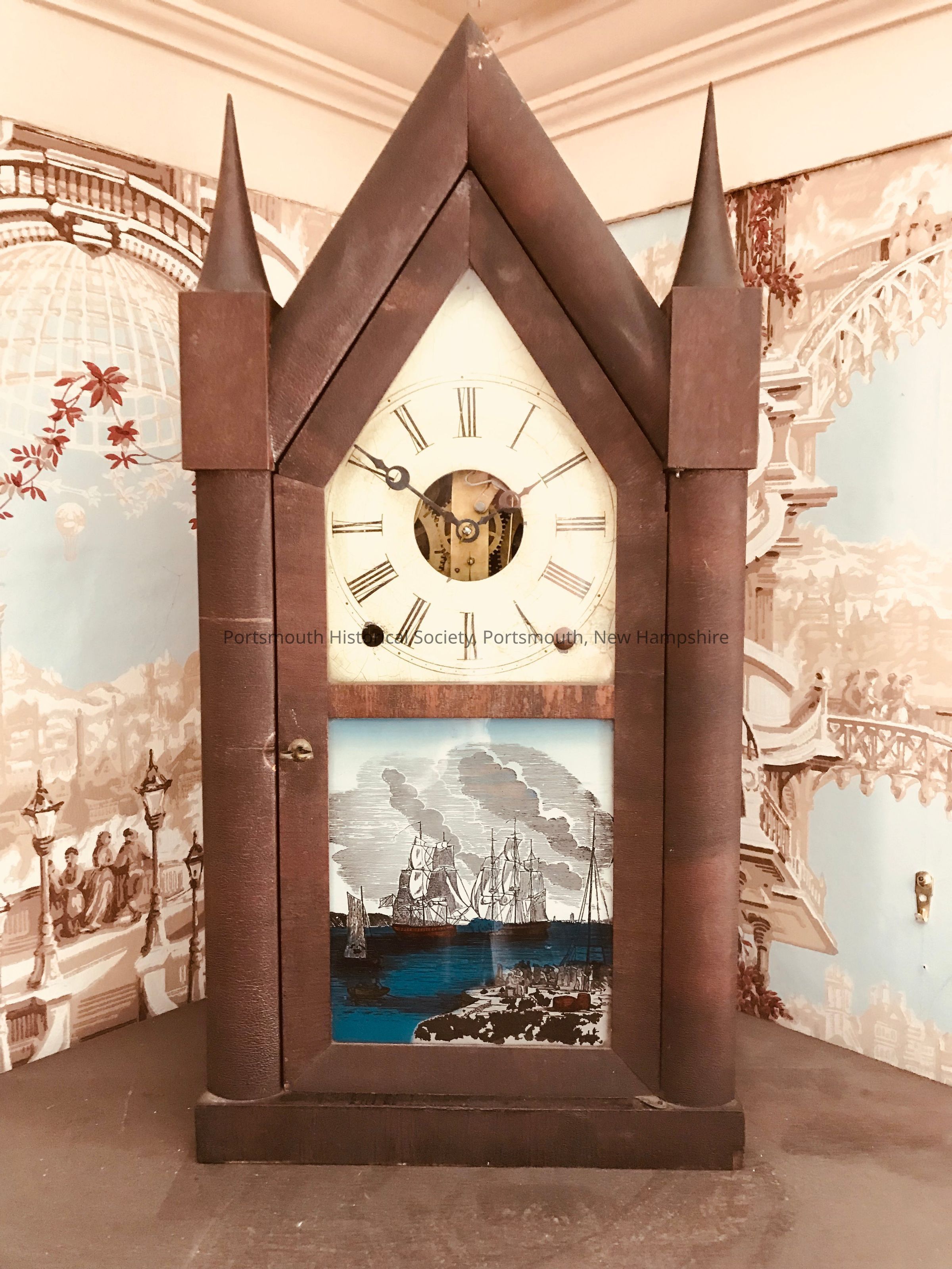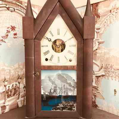 Steeple clock with reversed painting of JPJ’s battle in the North Sea in 1779 between the Bon Homme Richard and the English ship Serapis. Painted image is primarily blue, brown, gray, and white. Ansonia Clock Co., Ansonia, Conn., with a large label featuring an eagle on inside of the backboard,Acquisition