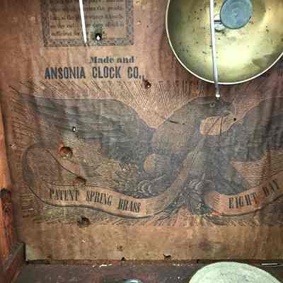 UDF21: Modern adhesive label: “Hodgdon #1”; red marker on interior center wood of clock door: “C14”; numerous ink inscriptions on inside of clock case [see inside of case for full inscription]: “Made and Ansonia Clock Co.”, “Patent Spring Brass Eight Day ClocksDimensions