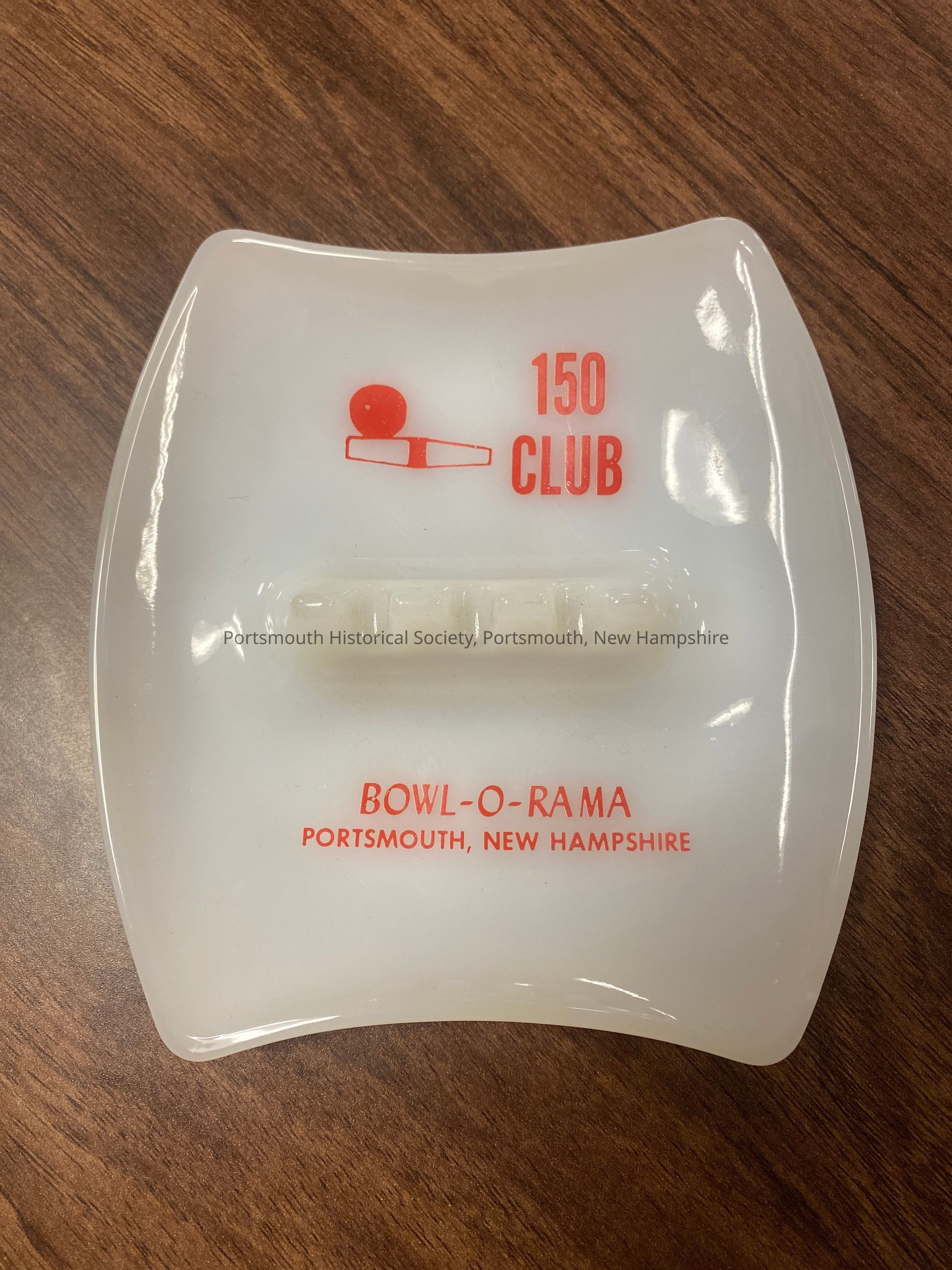 White ashtray, with red writing for the Bowl-O-Rama. There are three ridges for cigarettes Inscriptions on front, "150 / CLUB" to the right of candlepin and ball; below, "BOWL-O-RAMA / PORTSMOUTH, NEW HAMPSHIRE."Acquisition