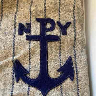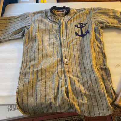 Short-sleeved shirt from a baseball uniform worn by a member of the Portsmouth Navy Yard team. Shirt is gray with navy blue pinstripes with applied blue letters "PNY" and an anchor on the proper left side. There is blue piping around the color and placket with five buttons, and blue trim around the sleeves and neck. Label sewn into collar reads: "SPORTING & ATHLETIC GOODS / THOS. E. WILSON & CO. CHICAGO / U.S.A. / MANUFACTURES" with a strip of off-white fabric underneath, presumably for a name to be written on.Collection