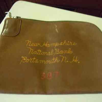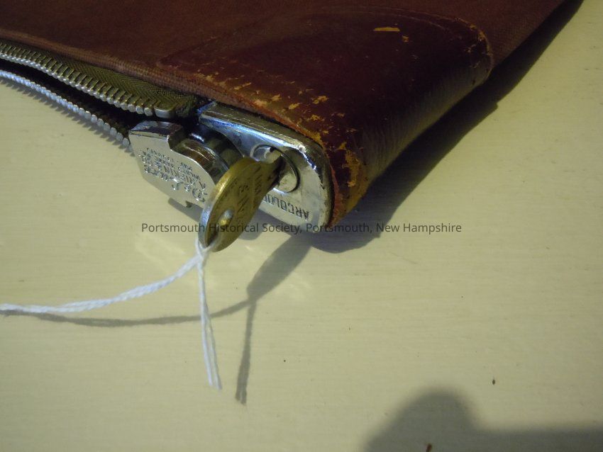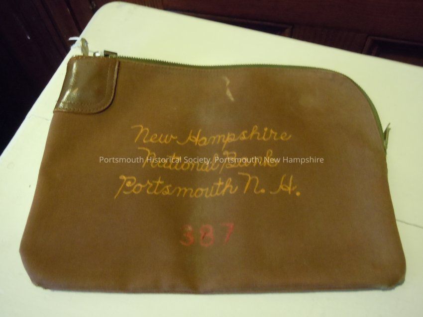 Horizontal canvas bag designed to hold cash, fitted zipper and lock-and -key; lock area reinforced with leather reinforcement stitched in place; sewn on front in yellow, in script, "New Hampshire / National Bank / Portsmouth N.H." with "387" sewn in red below.