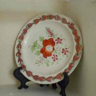 Small floral plate with copper lustre rim, with so-called "Queen's Rose" decoration at center and with floral border.Collection