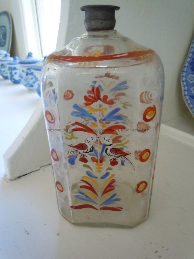 Hand blown Stiegel-style bottle (sometimes known as a flask or perfume bottle) with painted red, blue and yellow enamel decoration, pewter cap; 7 " tall. This type of glass was once attributed to the Pennsylvania glasshouse operated by Henry Wilhelm Stiegel, but it is now thought that most of it was made in central Europe, in Czechoslovakia, Germany, and elsewhere, and imported.Acquisition