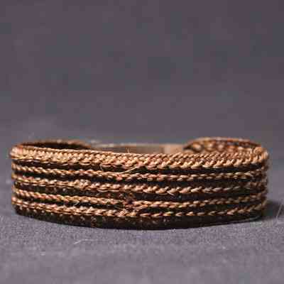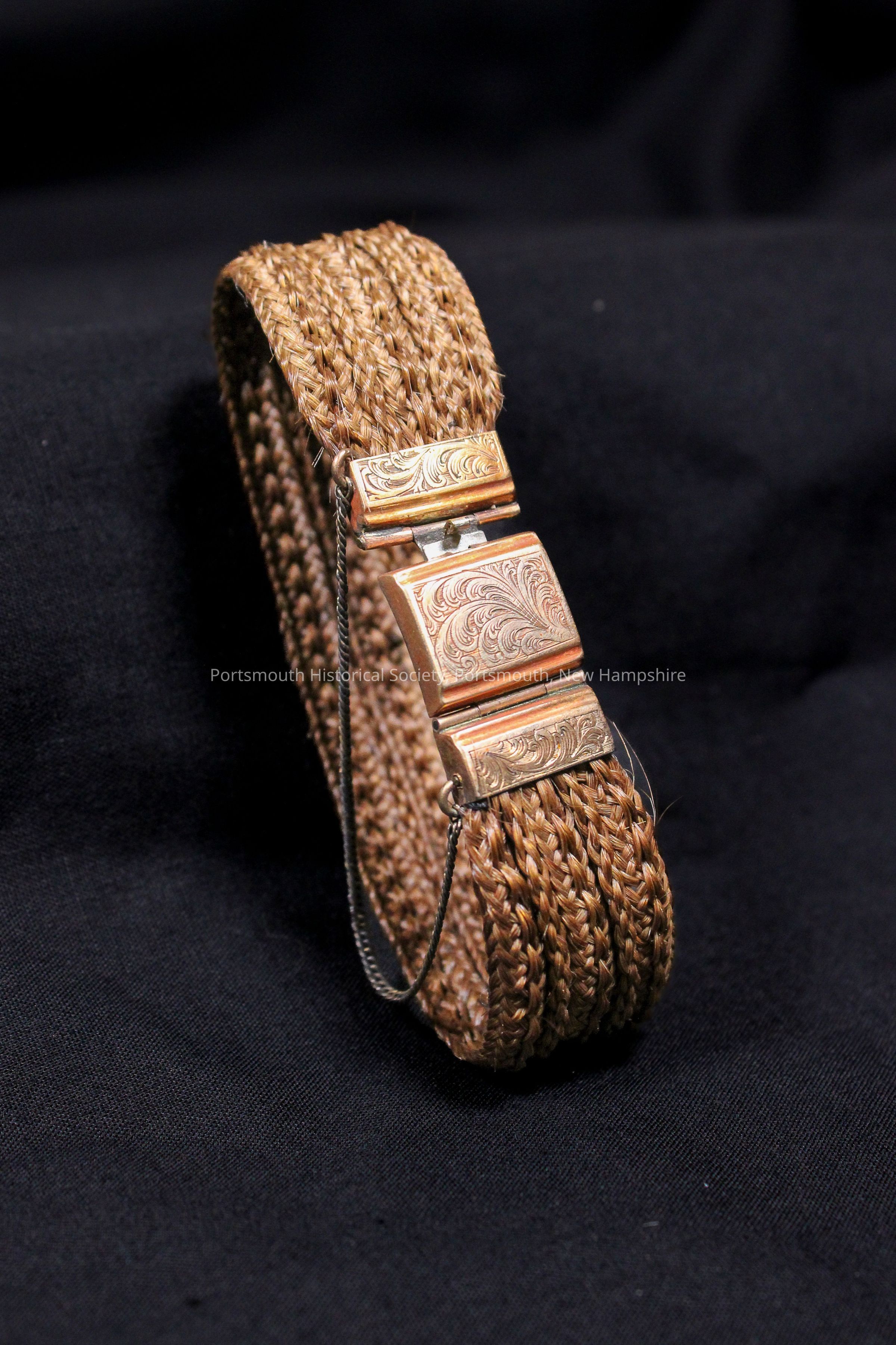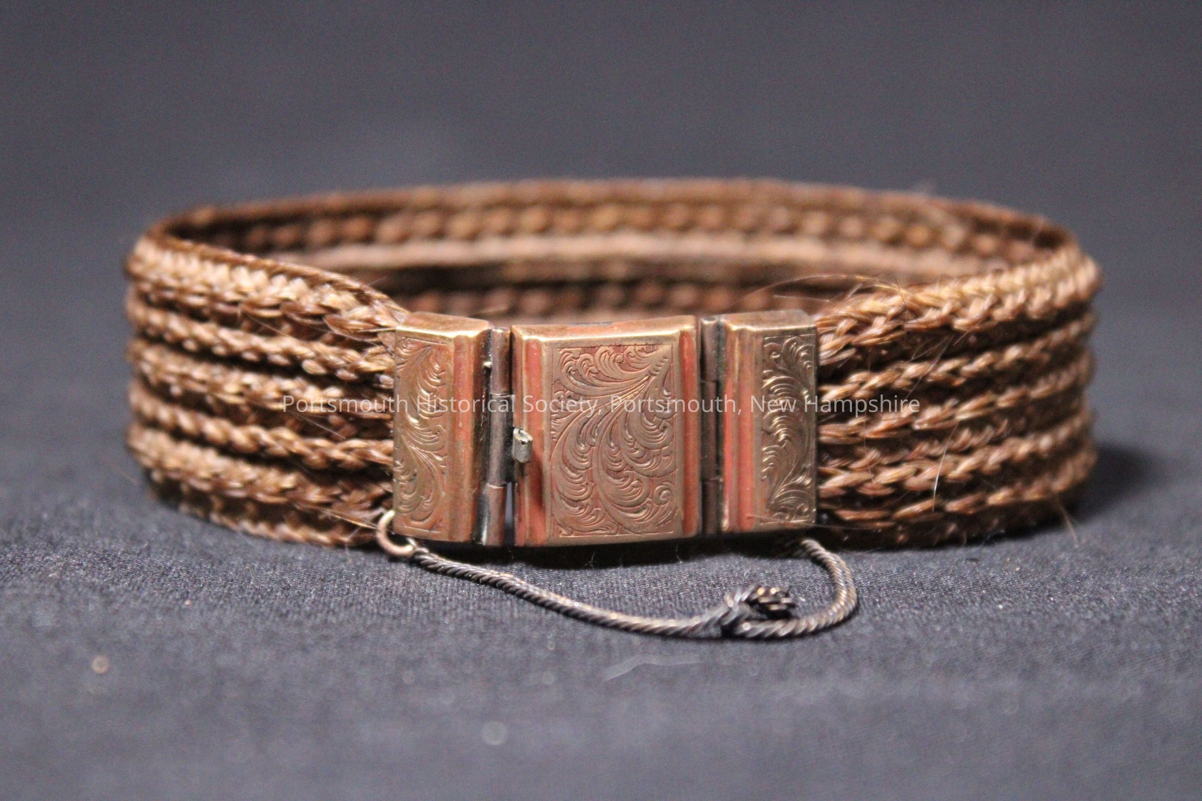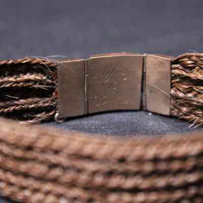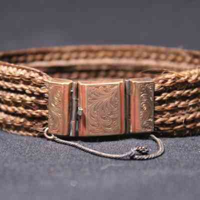Brown hair bracelet with gold engraved clasp and metal chain.Acquisition