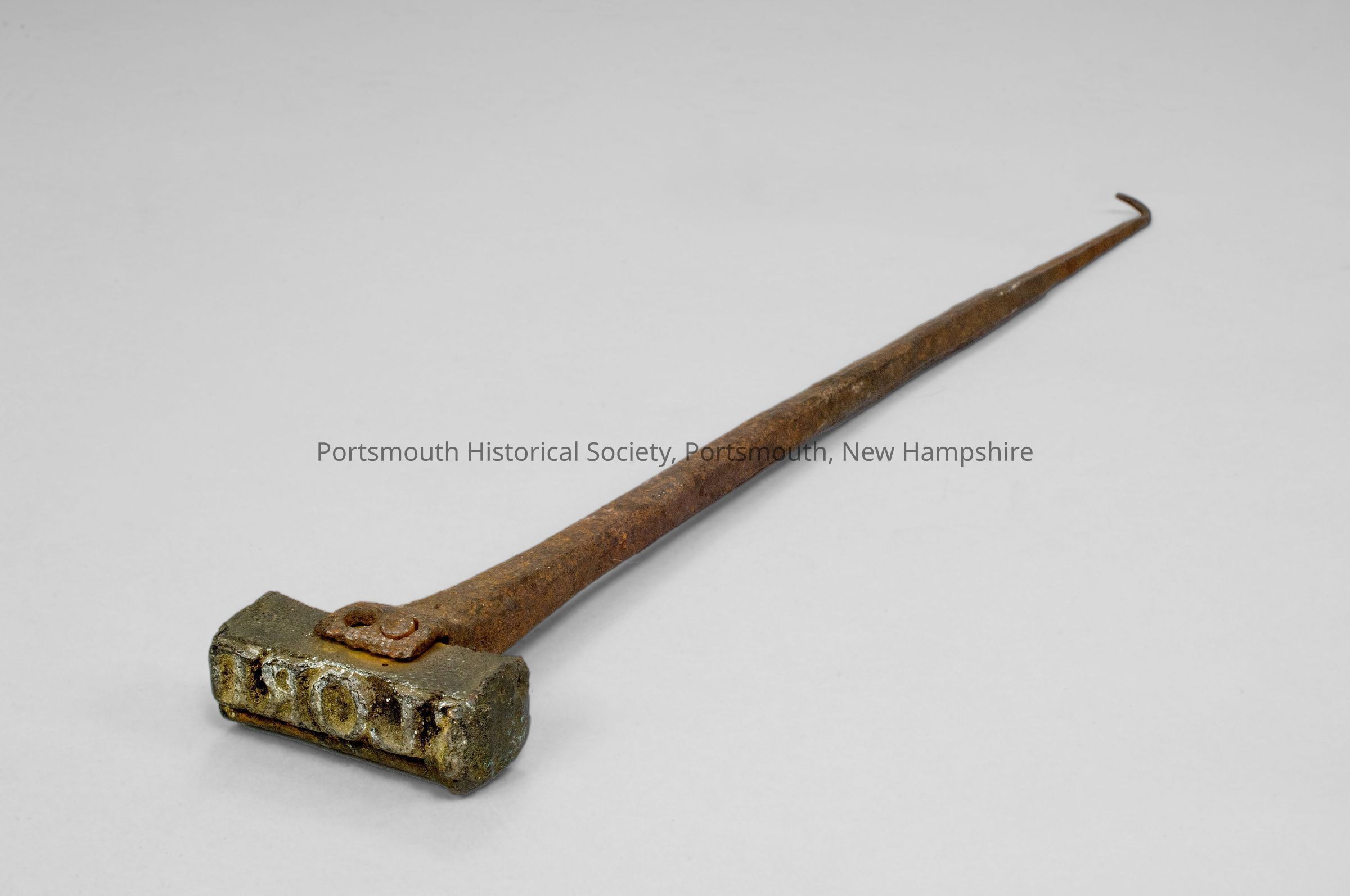 Branding iron, with tapering shaft narrowing to a small hook at one end; at other end, has rectangular brand reading LORD (or S.LORD) in caps screwed to the shaft (one screw missing.) The S is in poor condition