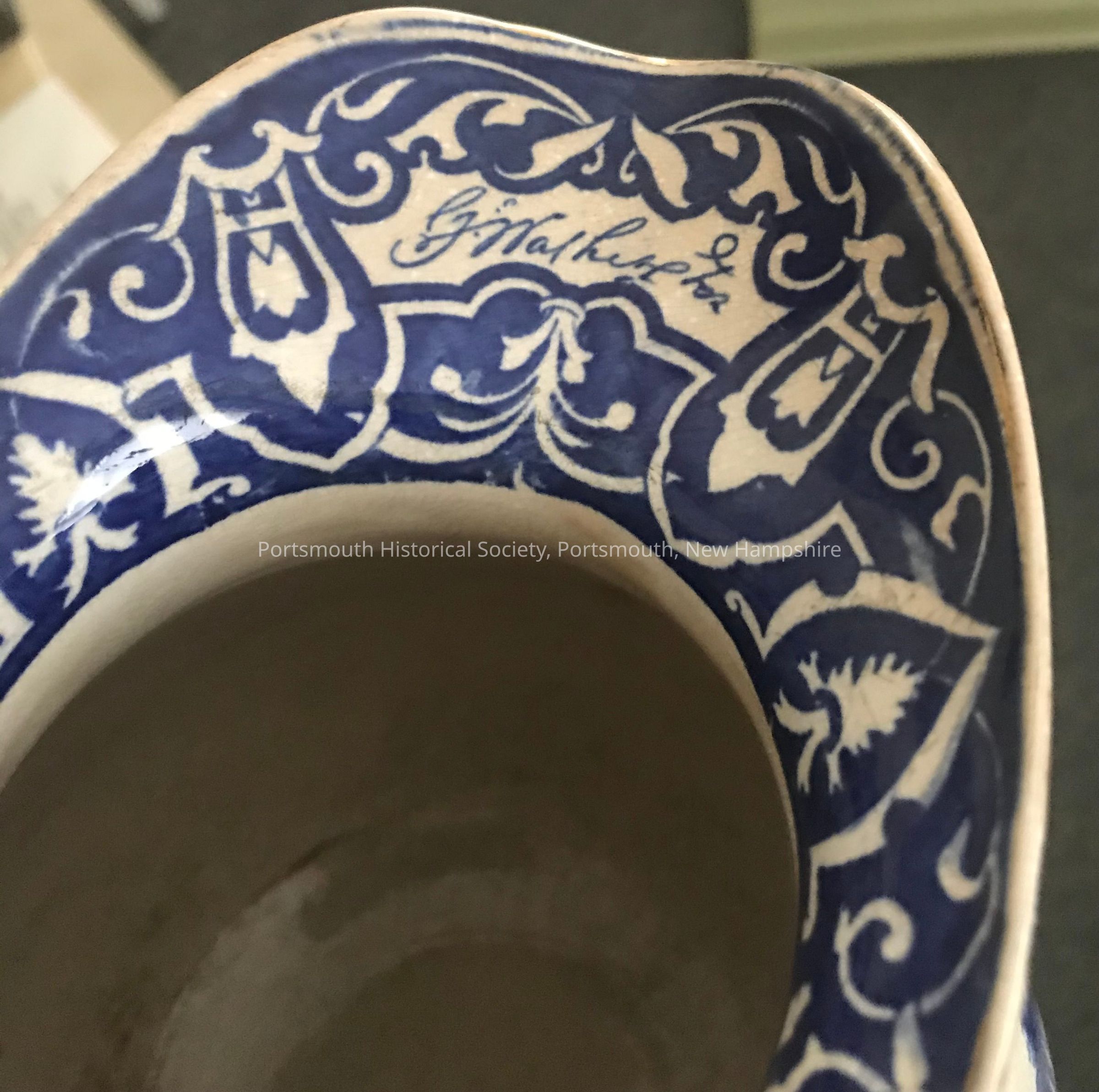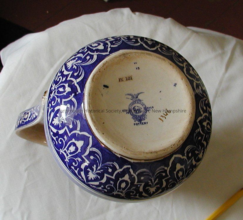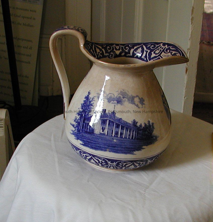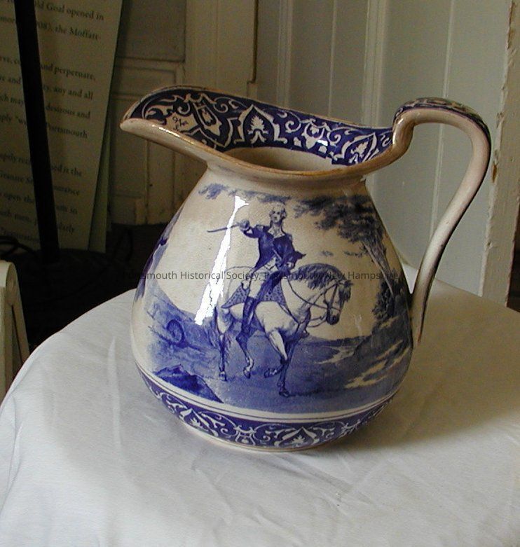 Pitcher with blue transfer and gold trim, made by Buffalo Pottery. One one side of the pitcher there is an image of Washington on horse , and Mount Vernon on the other. Below the spout is a front facing portrait of George Washington. Simulated signature of "G Washington" on inside lip of the spout.