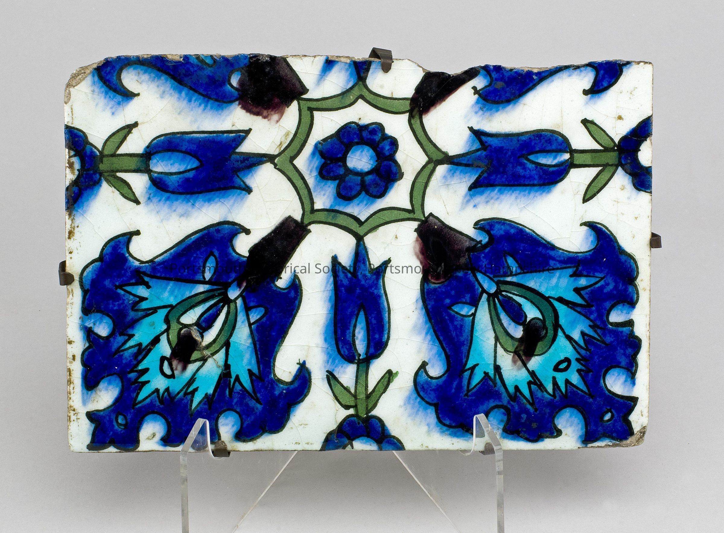 Old label: "This tile is supposed to be over 600 yrs. old. It illustrates the old Phoenician blue and purple so famous in history. Purchased at Damascus in 1872. Loaned by Miss Pauline Bradford."