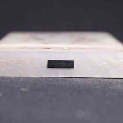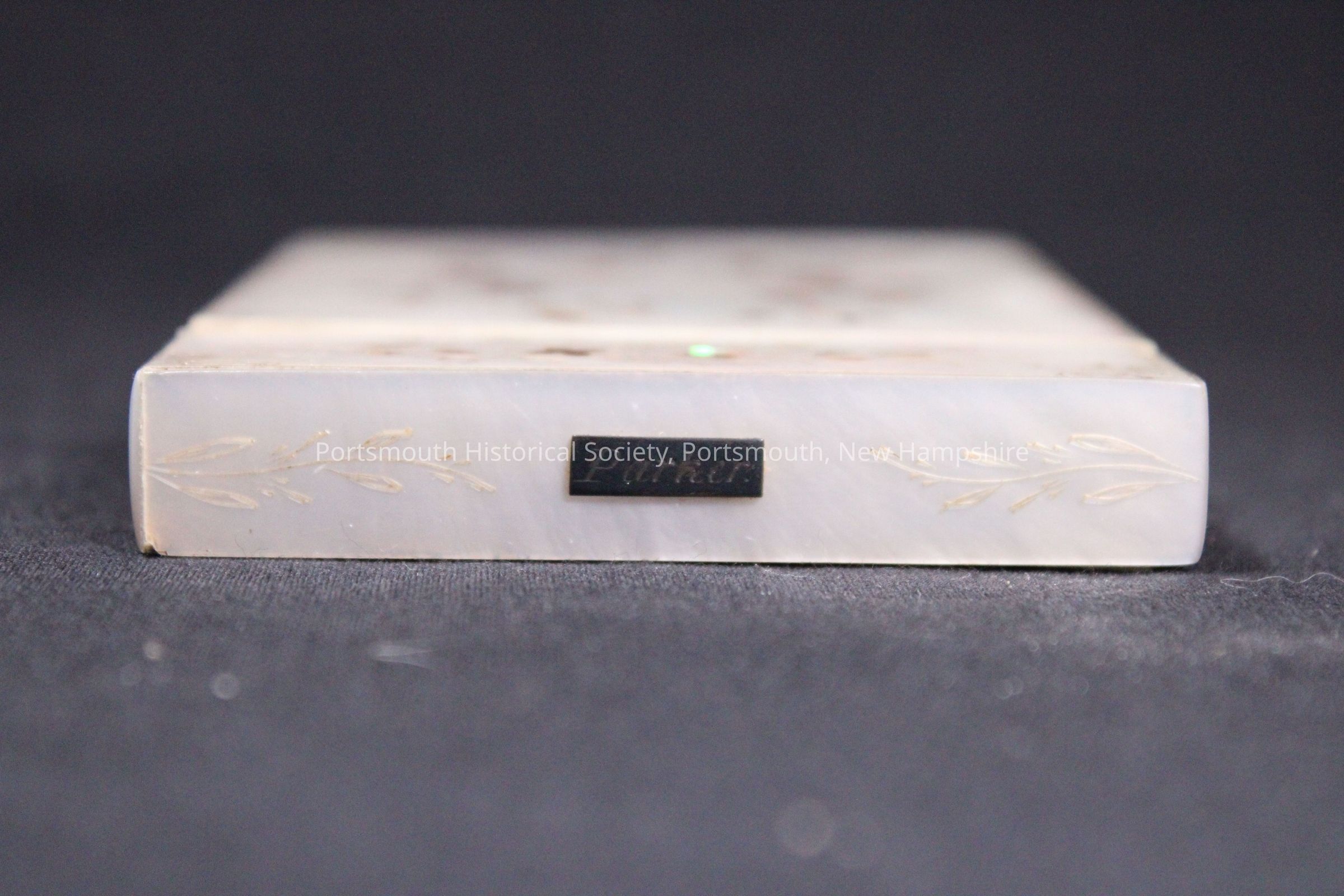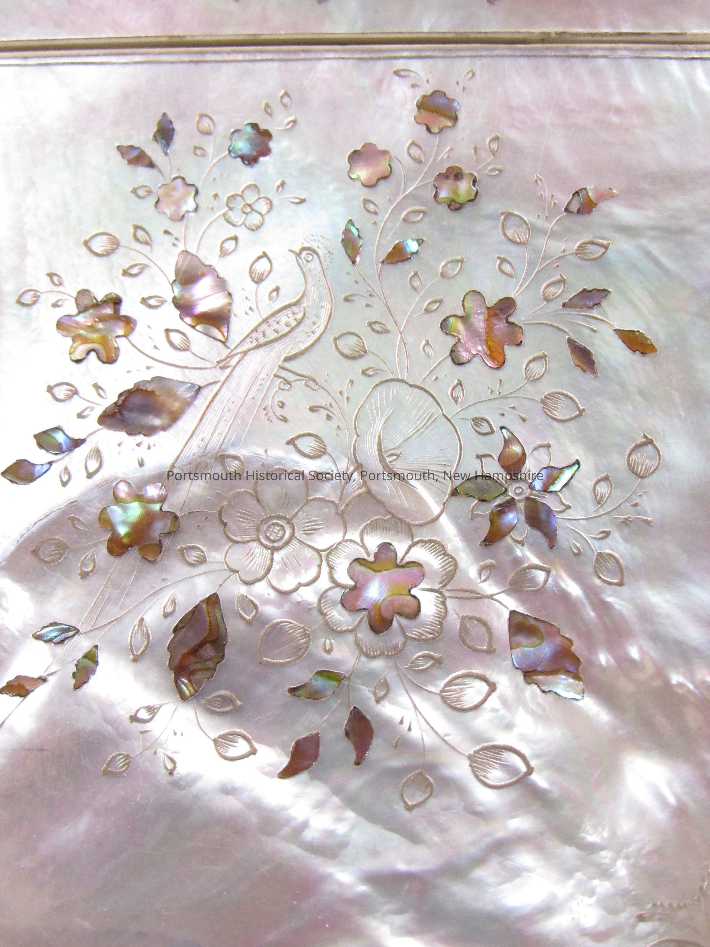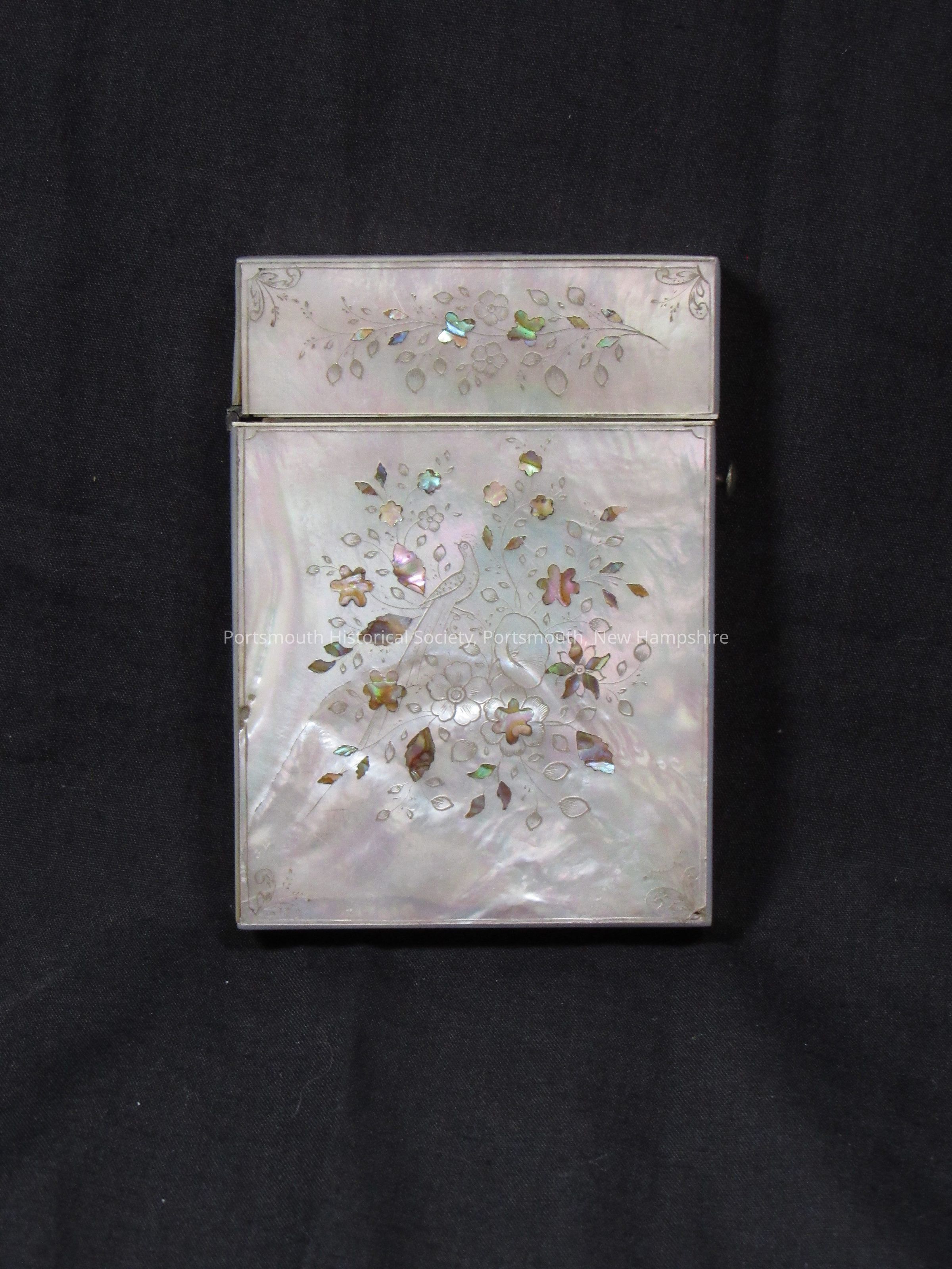 Mother of pearl calling card case with Japanese inlaid Shibayama decoration. "Parker" inscribed in top.Acquisition