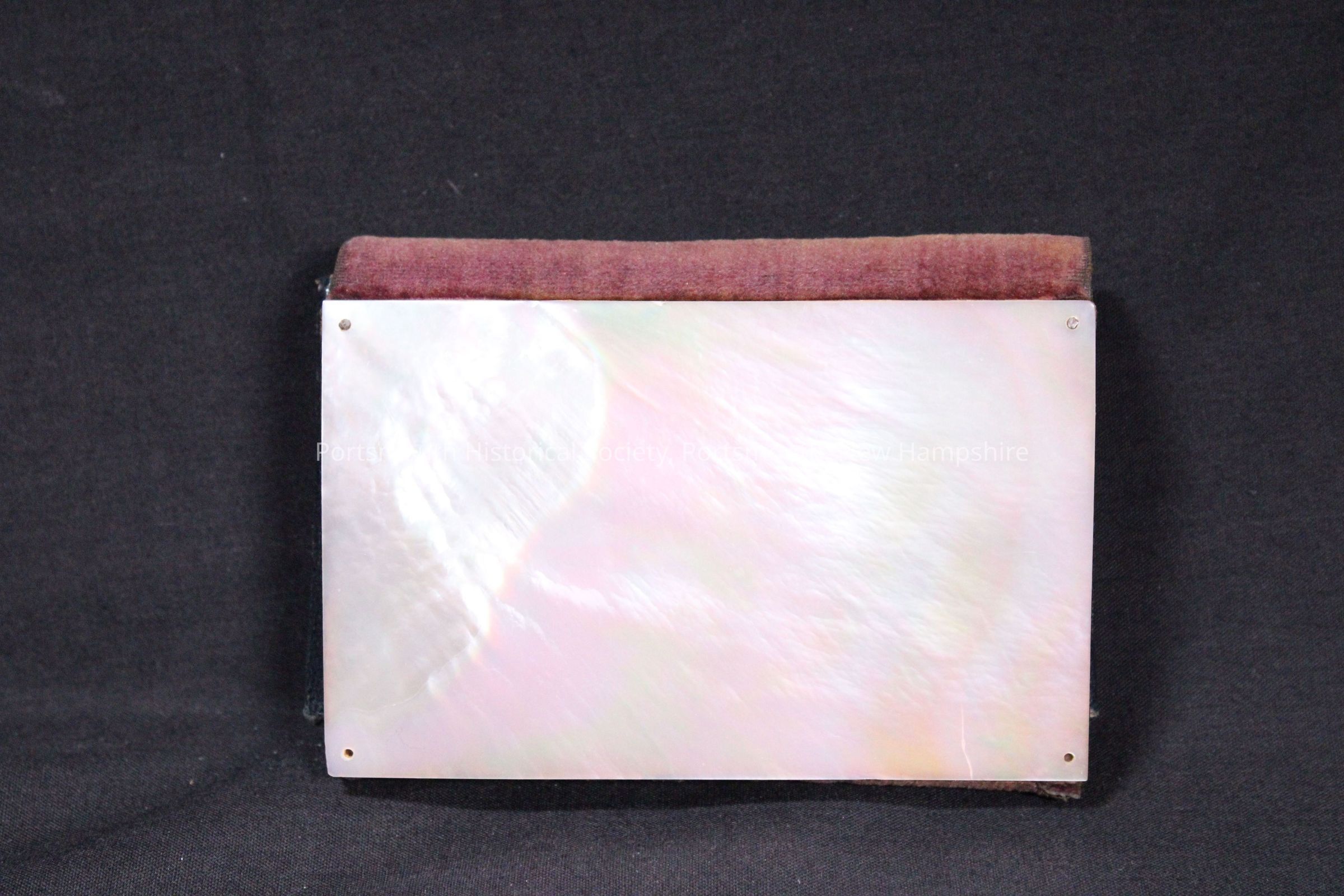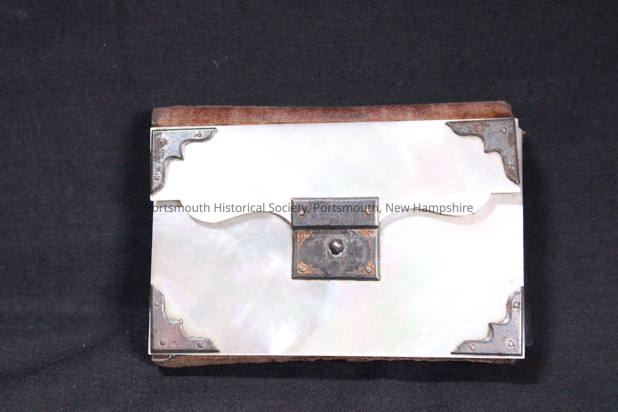 Calling cards in calling card case made of mother-of-pearl with silver inset around edge and on clasp. Inside is black leather with red satin or velvet lining. Binging is velvet on outside. Contains 4 calling cards for Captain Caleb Currier. Two pages in a small book of notes have writing on them. Some of the writing is illegible. One page says "Caroline E. Currier, January 1st 1846." Another page says "174 F... Av..., New York, Mr. John... Vog..., 22 ... St, Mrs. M..nnett .25, M.. .... .31, Mrs. .... .09."Acquisition