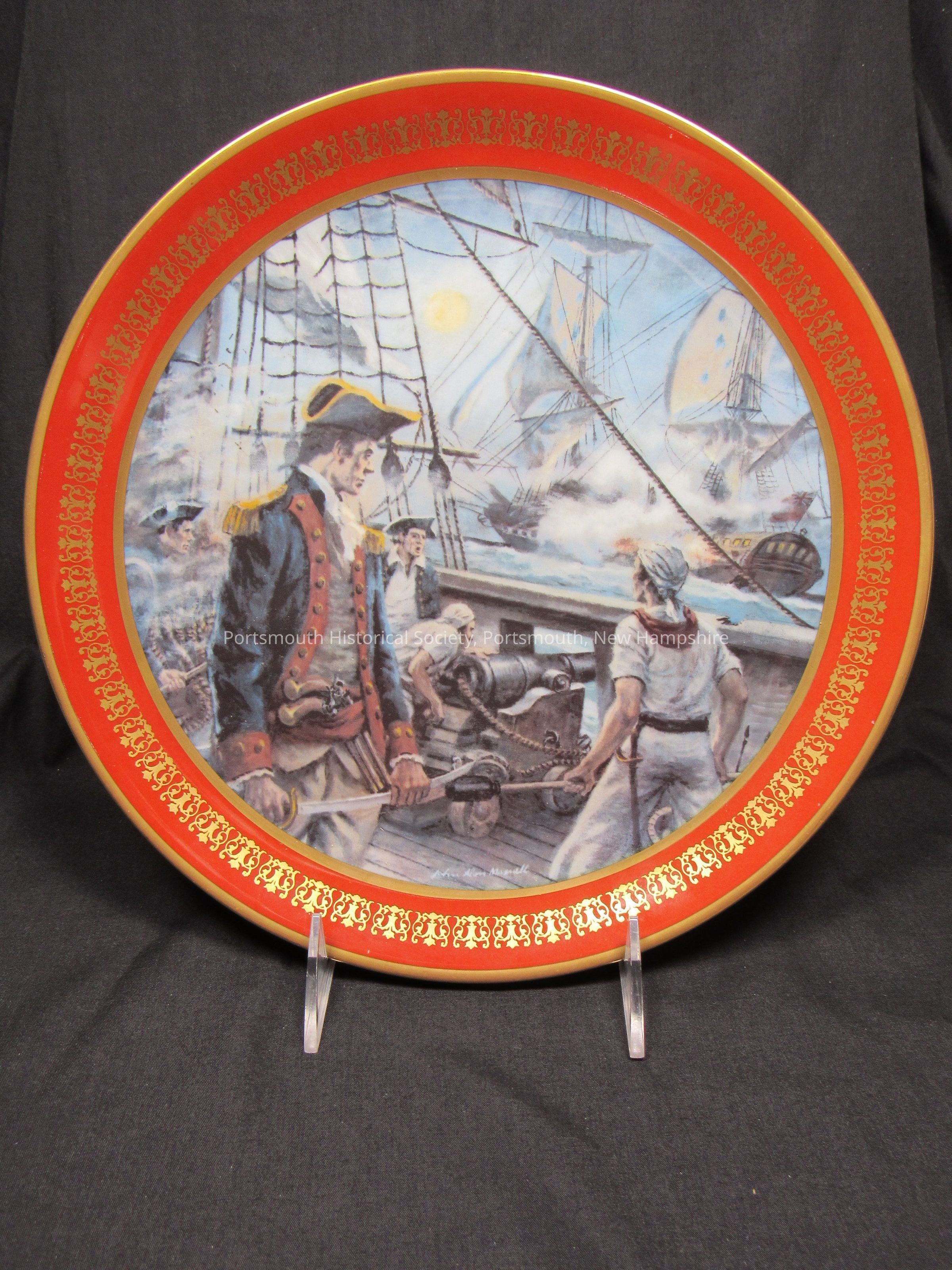 Ceramic plate featuring battle scene with John Paul Jones in the center with a red and gold decorative border. . On back: ‘THE RIM OF THIS PLATE IS A REPLICA OF AN 18TH CENTURY DESIGN [in curved text] / [depiction of an eagle] / Revolutionary Eagle / John Paul Jones / Scotland 1747-1792 / The Early American Edition / Plate No. [blank] of an Edition of 1,976 from a / Painting by John Alan Maxwell / The Commemoratives Fine Arts Society / INCORPORATED / FOREST, VIRGINIA 24551 / “CASTLETON STUDIOS © / [around lyre] / MADE IN U.S.A. [in banner] / MEMORIALIZING THOSE WHO HAVE CONTRIBUTED SIGNIFICANTLY TO THE DEVELOPMENT OF AMERICA [in curved text]” Also inscribed in gold paint: “Border – 1475 - #24 / Center – 1475 - #24”Acquisition