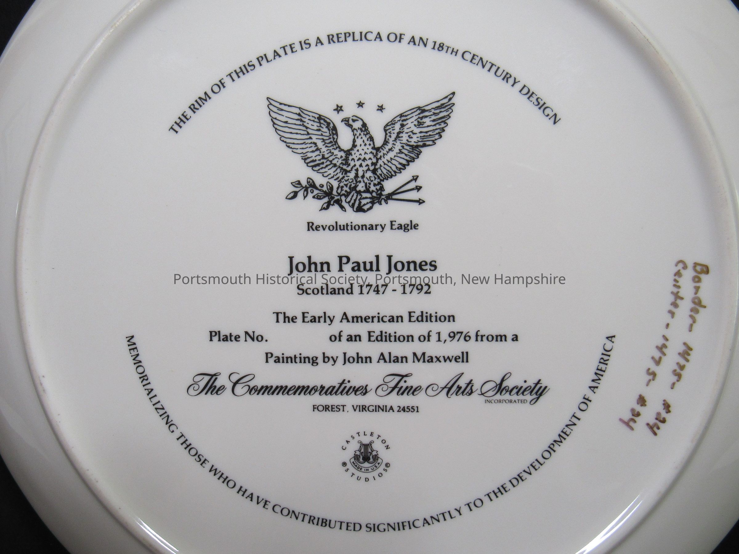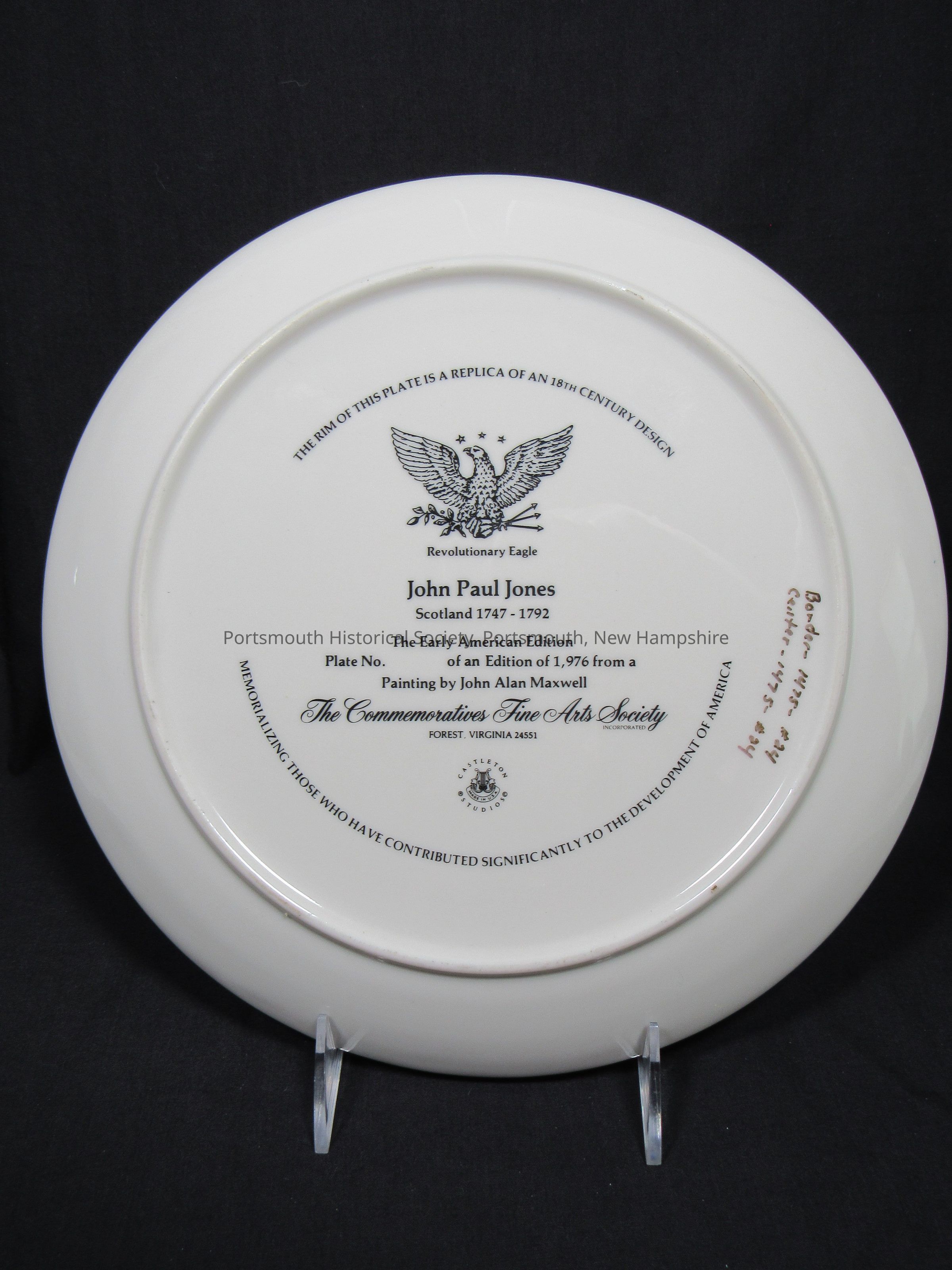 ‘THE RIM OF THIS PLATE IS A REPLICA OF AN 18TH CENTURY DESIGN [in curved text] / [depiction of an eagle] / Revolutionary Eagle / John Paul Jones / Scotland 1747-1792 / The Early American Edition / Plate No. [blank] of an Edition of 1,976 from a / Painting by John Alan Maxwell / The Commemoratives Fine Arts Society / INCORPORATED / FOREST, VIRGINIA 24551 / “CASTLETON STUDIOS © / [around lyre] / MADE IN U.S.A. [in banner] / MEMORIALIZING THOSE WHO HAVE CONTRIBUTED SIGNIFICANTLY TO THE DEVELOPMENT OF AMERICA [in curved text]”