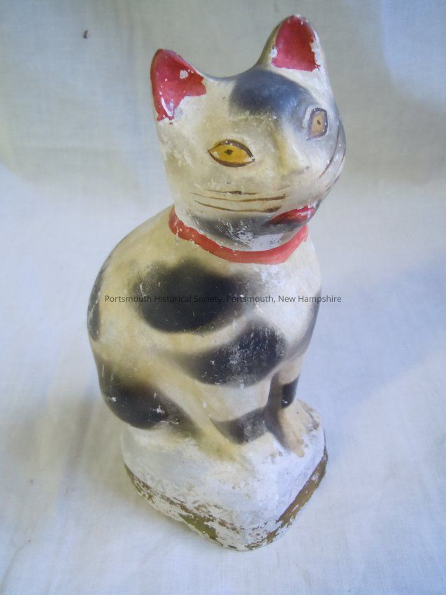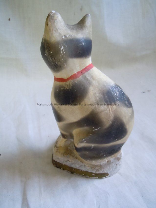 Chalkware (plaster of Paris in book) cat with black markings and red collar.Acquisition