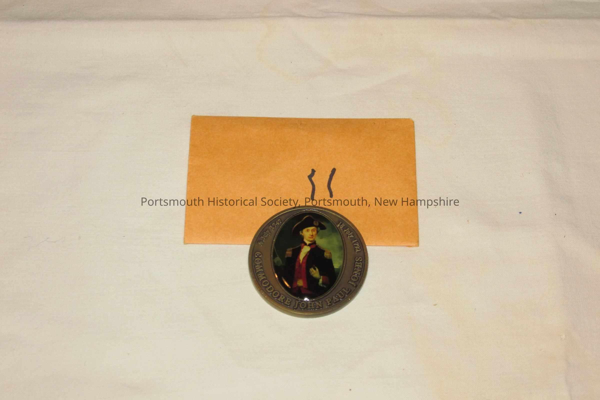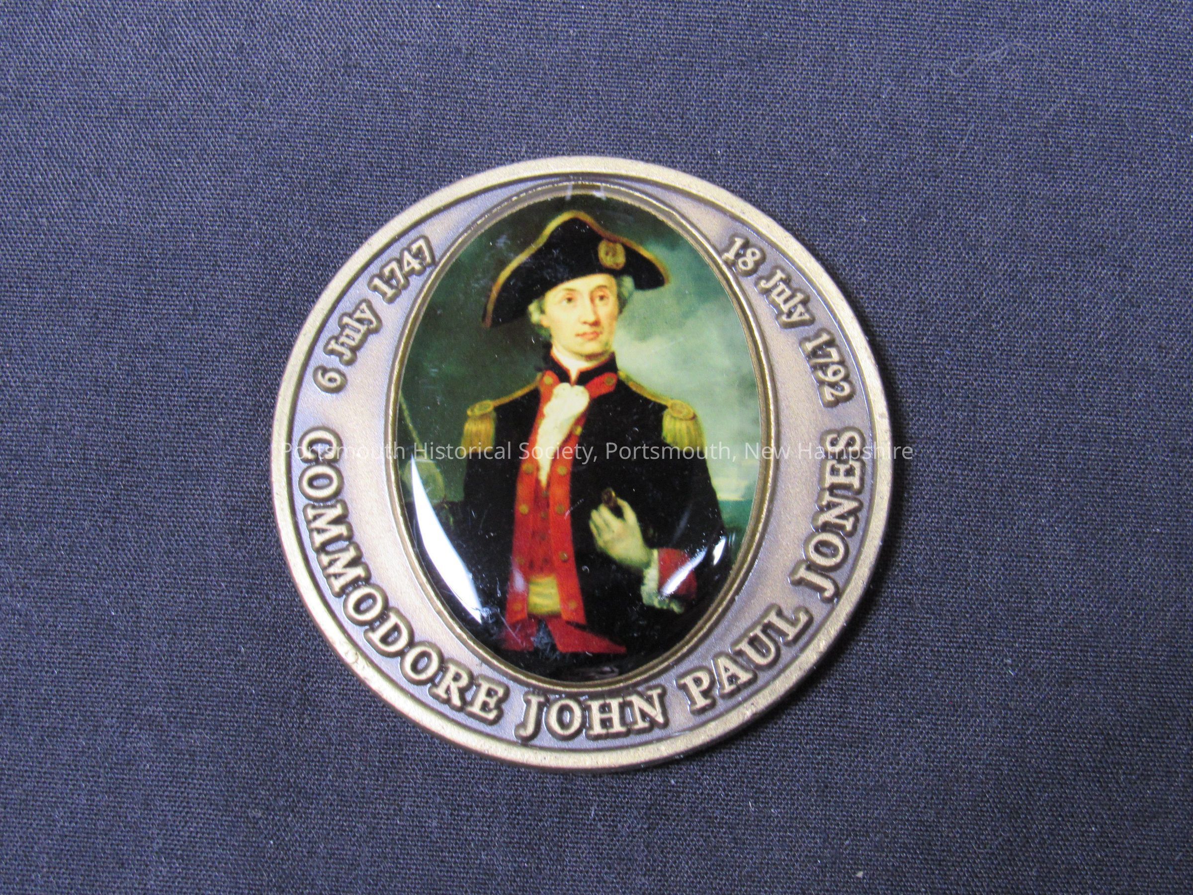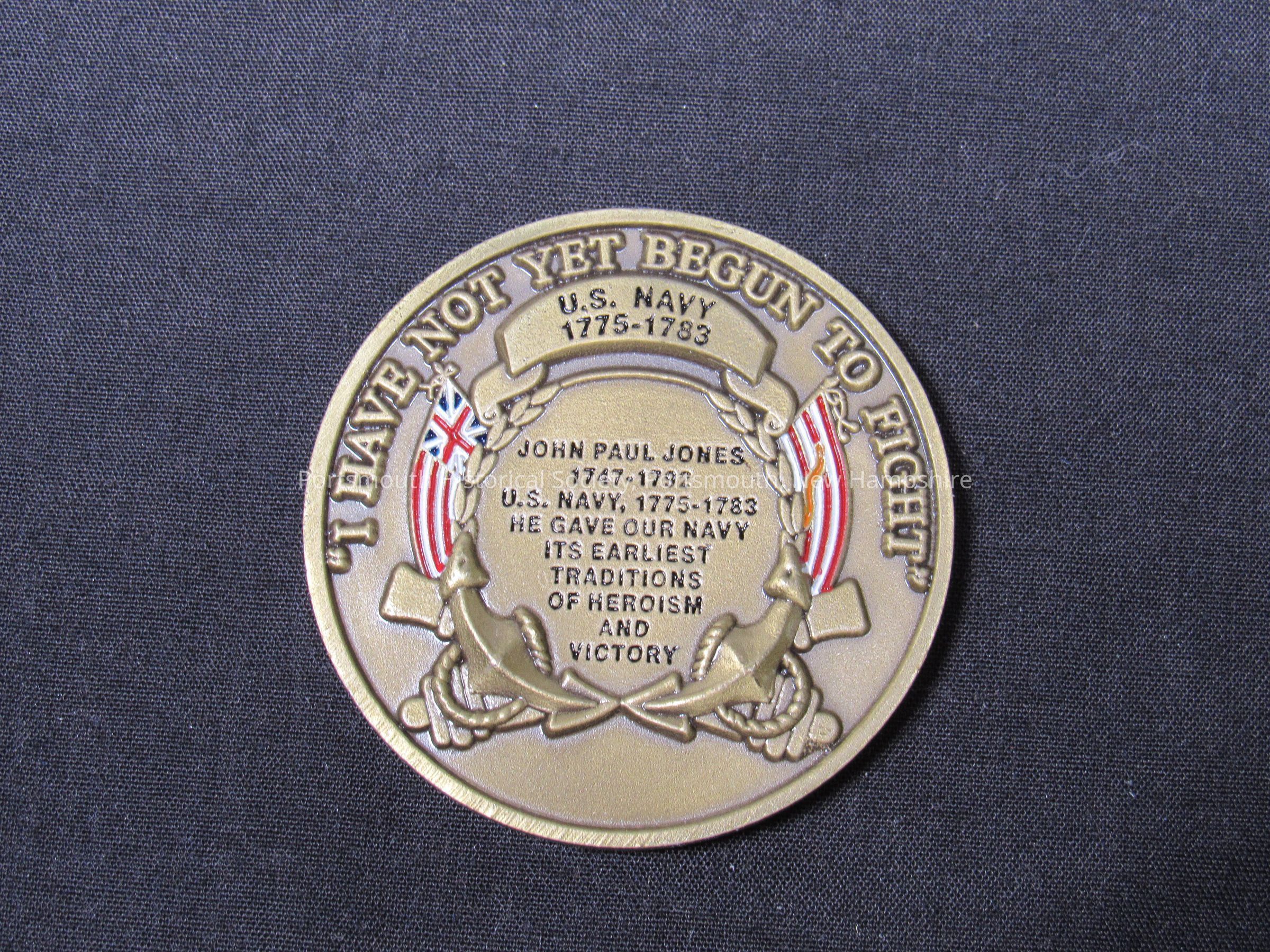 "COMMODORE JOHN PAUL JONES/ 6 JULY 1747 / 18 JULY 1792" around polychrome image of JPJ on one side; "I HAVE NOT YET BEGUN TO FIGHT" and other text on reverse.Acquisition