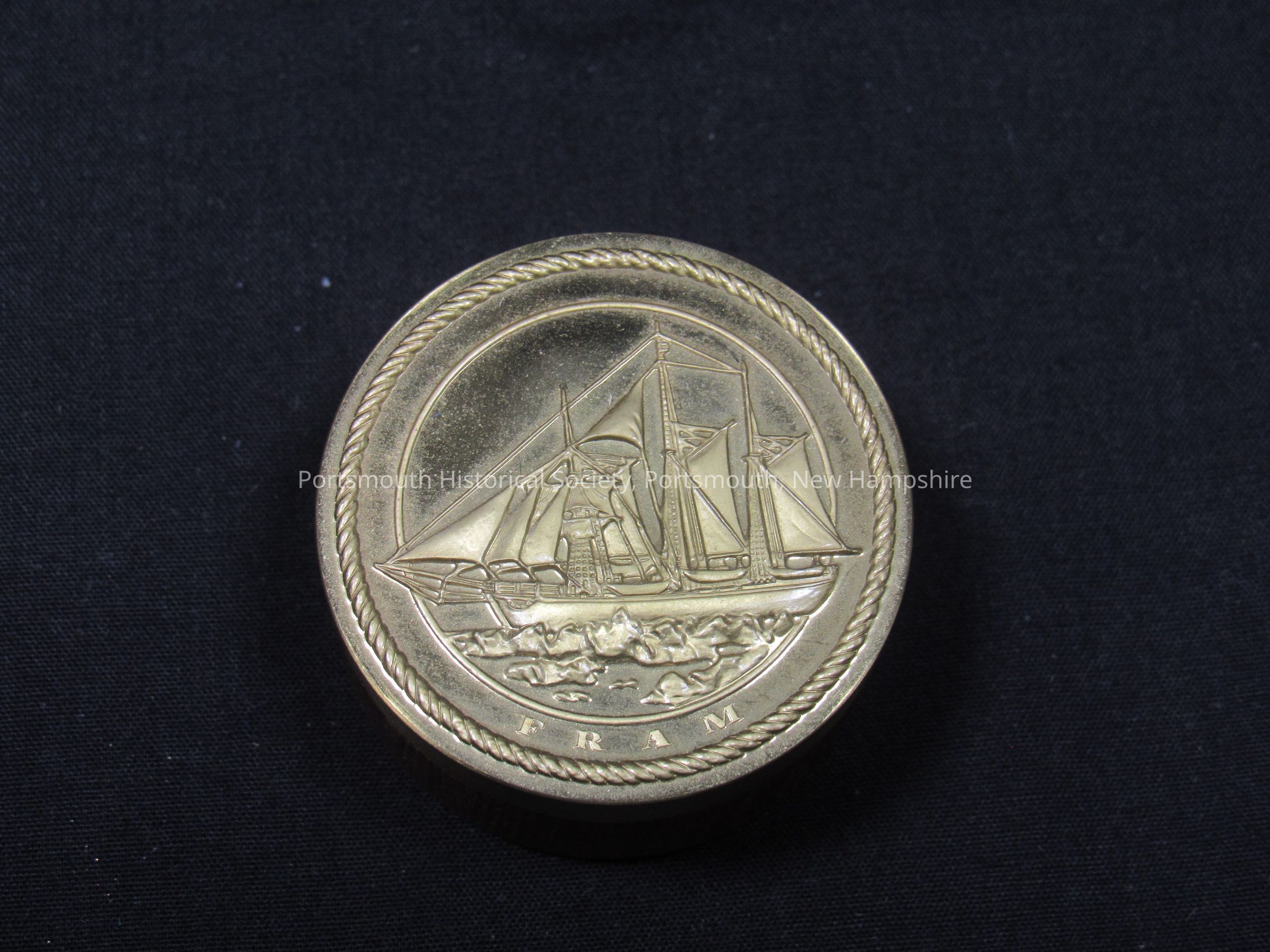Eight of nine small containers featuring images of ships, with the Fram on the lid. Brass lids, wooden containers. Lids marked “© [symbol] 82”Acquisition