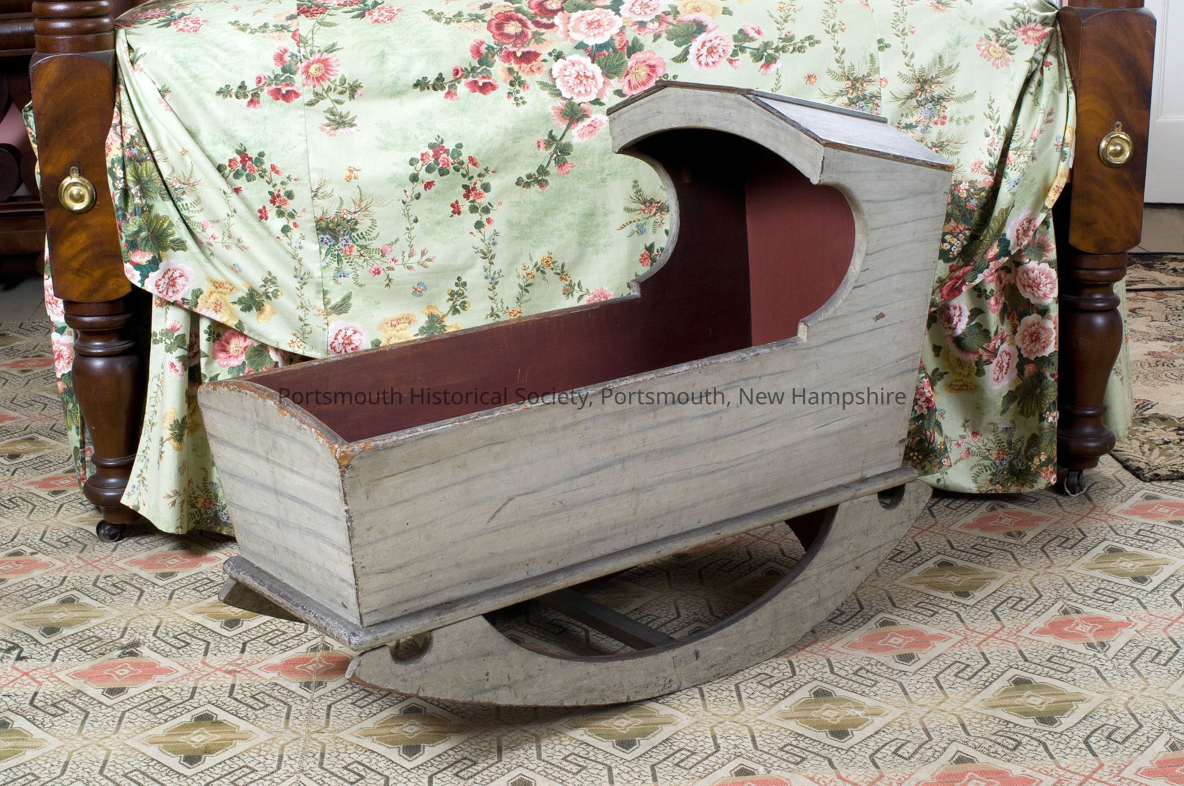 Cradle has a flattened arch hood and rounded arched valance. The headboard has scooped sides. The cradle has a rounded arch footboard and sleigh-type rockers (in opposite direction, to be used aboard ship). The interior is red and the exterior is birch-grained. Unusual form rockers for this otherwiseAcquisition