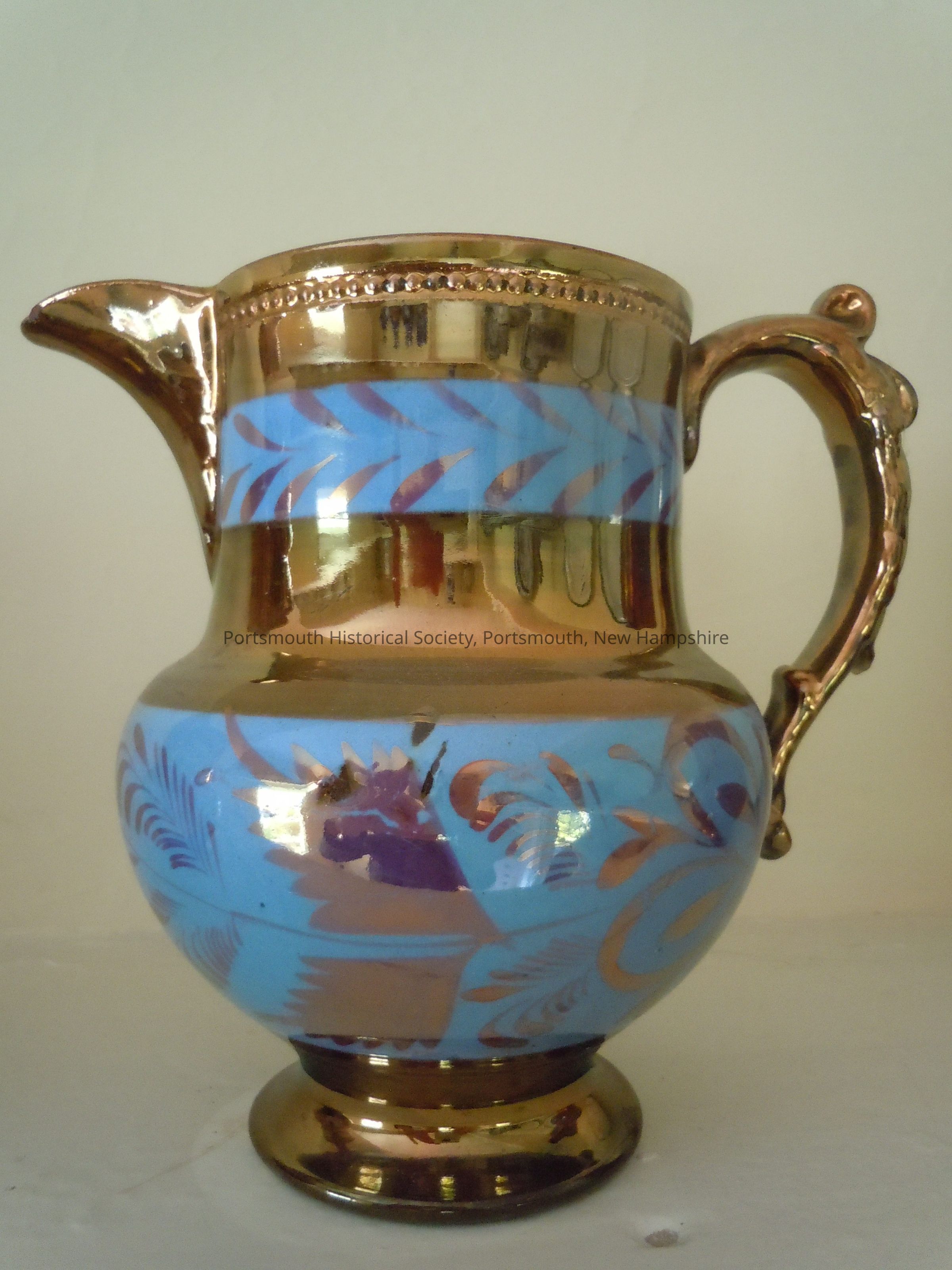 Large copper lustre creamer with light blue trim, England, 1810-30