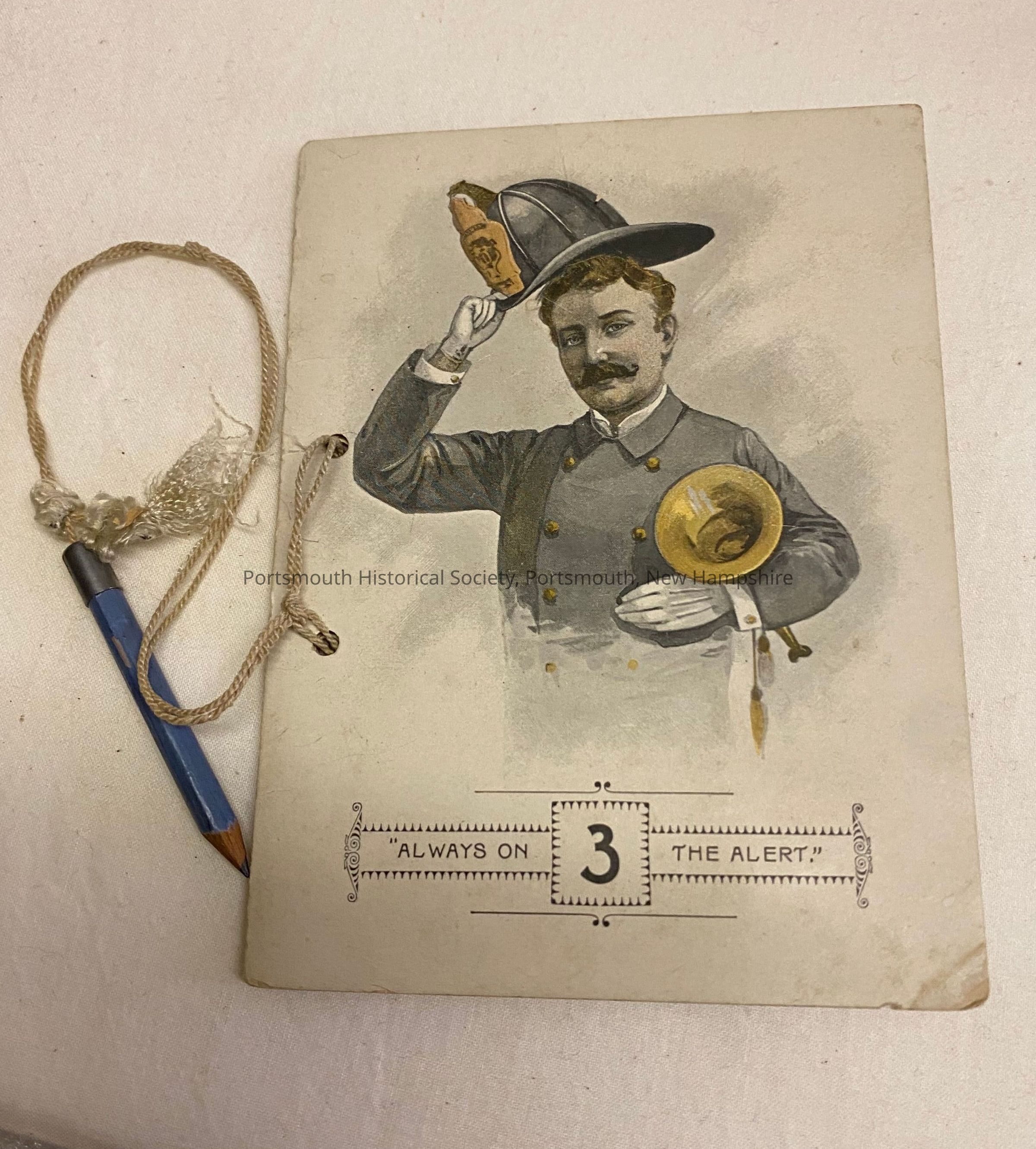 Seven of eight dance cards for the Kearsarge Fireman's Ball. This is from the twentieth annual ball held on December 31, 1895. The front has an image of a fireman, tipping his helmet and holding a trumpet under his arm. "ALWAYS ON THE ALERT" is along the bottom with the number "3" in the center. A blue pencil is attached with string.Collection