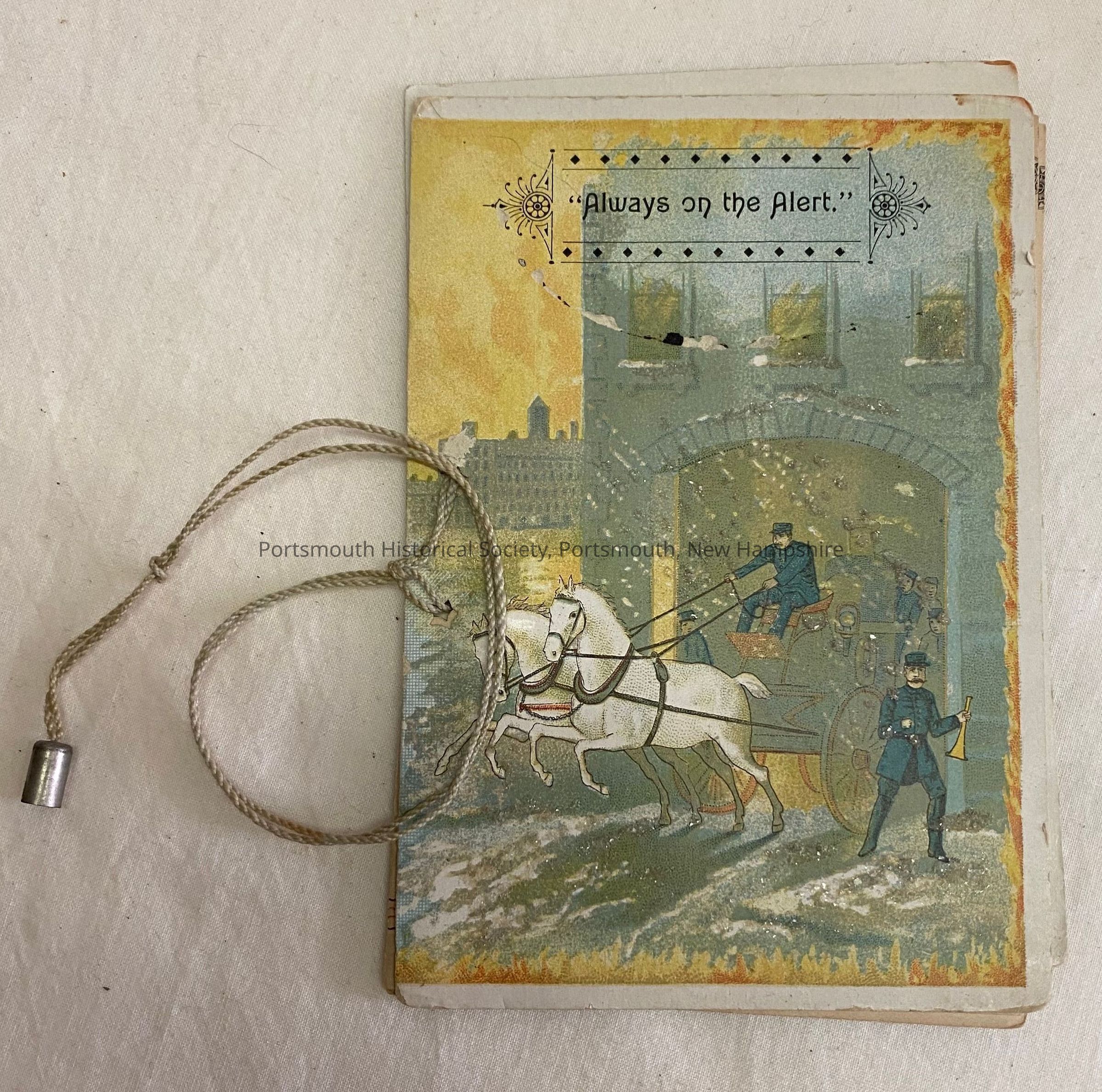 Eight of eight dance cards for the Kearsarge Fireman's Ball. This is from the fourteenth annual ball held on December 31, 1889. The front has an image of a horse drawn cart with two firemen in coming out of the station. The pencil is missing but the string and metal are still attached.Acquisition