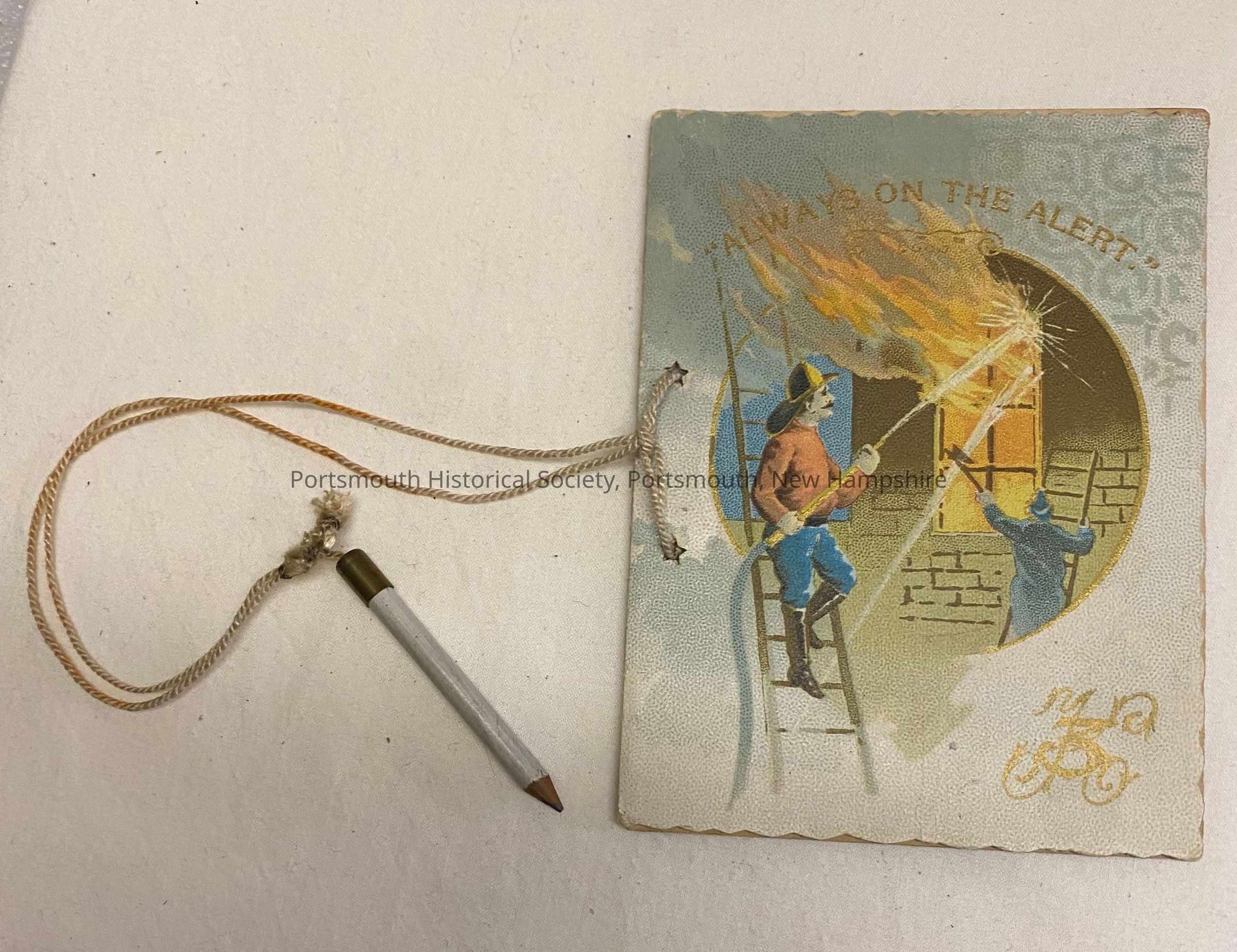 One of eight dance cards from the Kearsarge Fireman's Ball. This card is from the Sixteenth Annual on December 31, 1891. The front of the card has an image of two firemen fighting a fire with the phrase, "ALWAYS ON THE ALERT." above. White pencil is attached to card with string.Acquisition