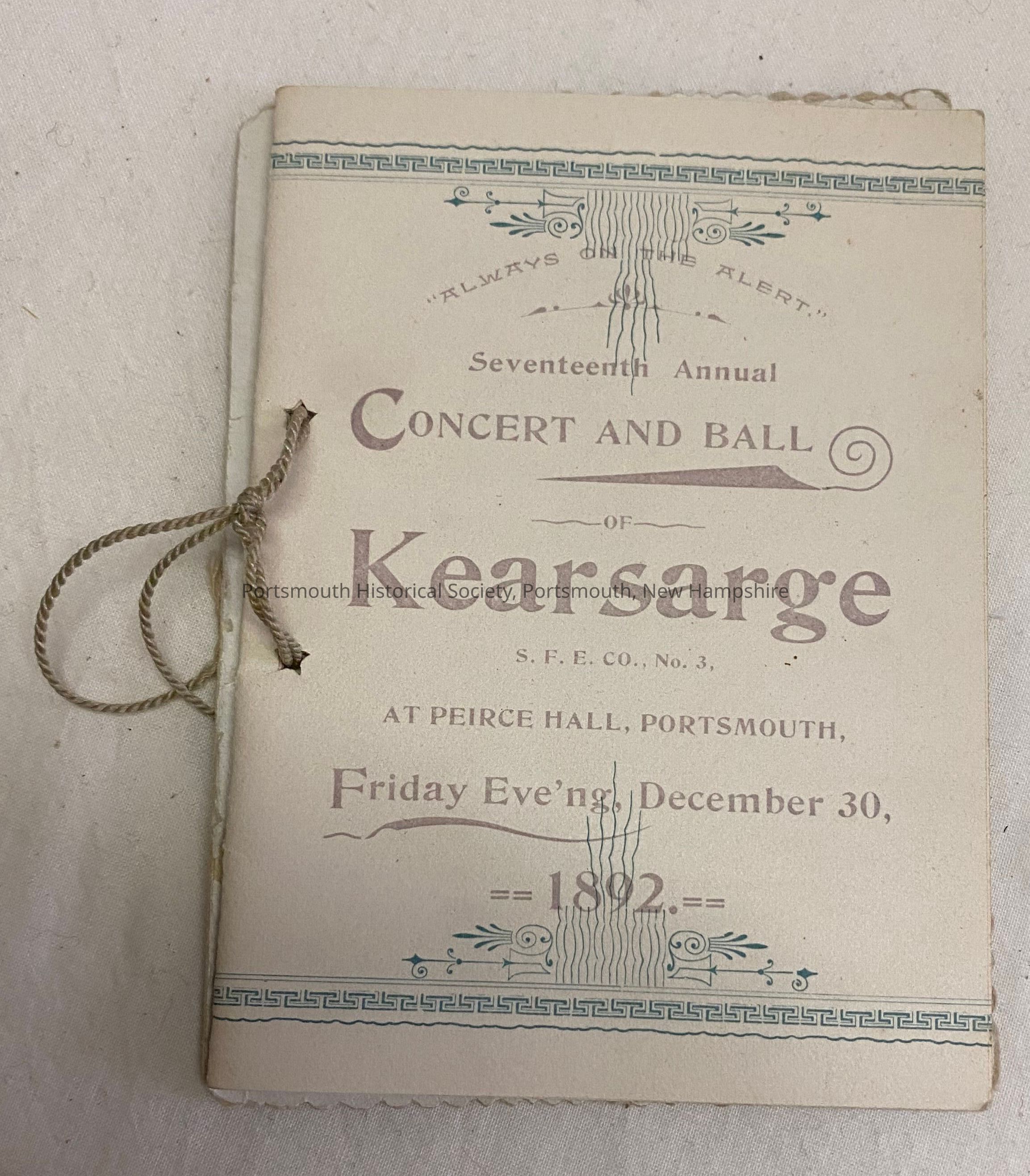 Two of eight dance cards for the Kearsarge Fireman's Ball. This is for the seventeenth annual, held on December 30, 1892. Front has green Greco-Roman designs on top and bottom with purple typeface on front. Pencil is missing but string is still attached.Acquisition
