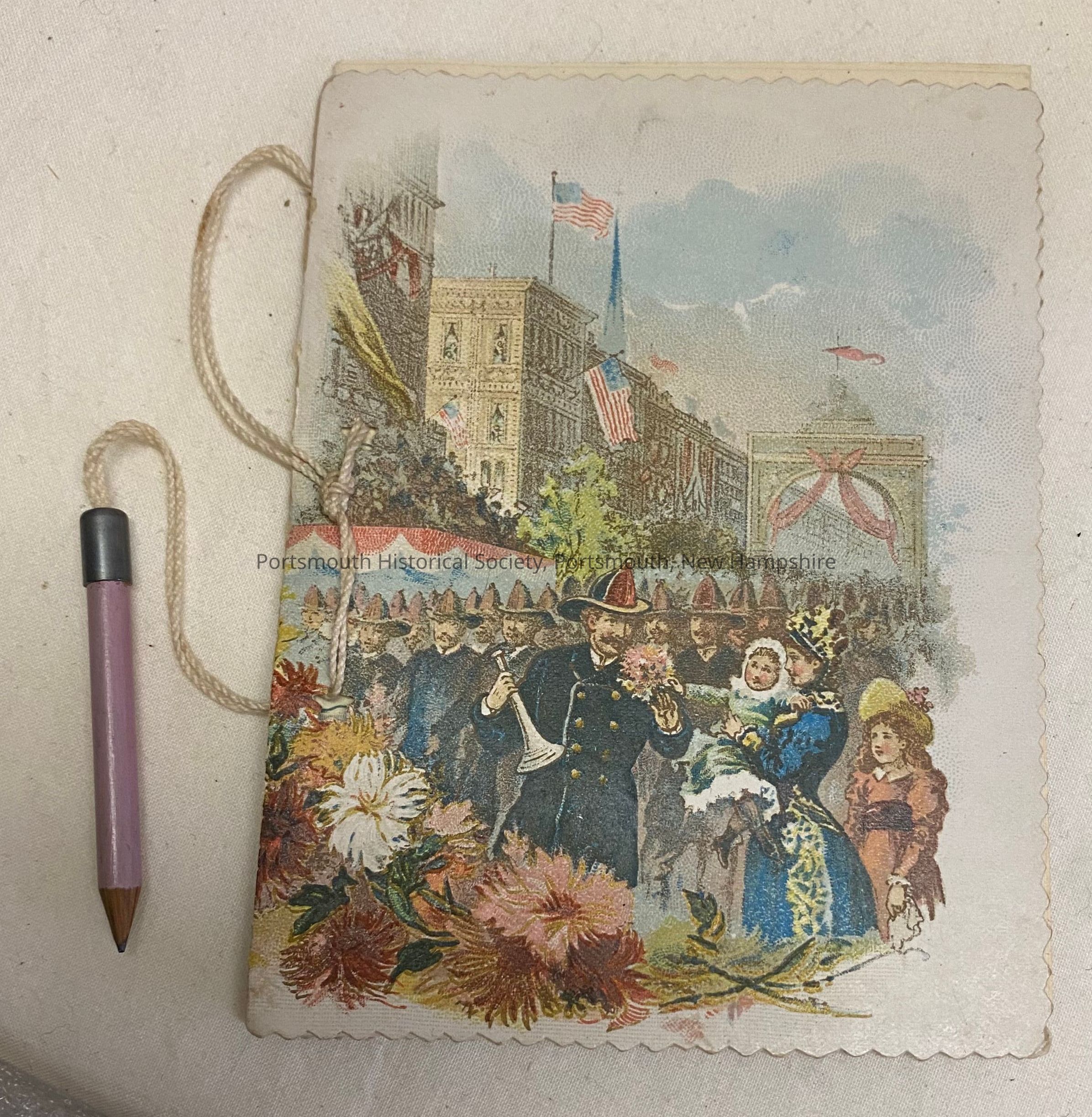 Three of eight dance cards for the Kearsarge Fireman's Ball. This is from the eighteenth annual ball held on December 29, 1893. The front has an image of a parade of firemen with one highlighted in the foreground with a woman holding an infant and a young girl. A purple pencil is attached with string.Acquisition
